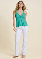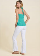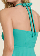 Its swingy hemline gives this halter tie top a babydoll silhouette that delivers plenty of flirt. Narrow braided trim wraps under the bustline and along the V-neck, transitioning into the braided halter tie that adjusts to your perfect fit. Smocking at the back creates a fitted bodice for playful contrast. * Sizes: XS (2), S (4-6), M (8-10), L (12-14), XL (16) * Plus sizes: 1X (18-20), 2X (22-24), 3X (26-28) * Braided halter tie neckline * Unlined * V-neck with braided trim * Smocking at back * Fabric has stretch * Viscose/spandex. Imported