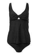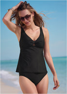 Get set for vacay with this tankini set in your getaway bag! Achieve flattering coverage with the twist-front detail and wider shoulder straps, yet reveal a subtly flirty peek with a cutout just below. Matching moderate coverage bottoms are included, assuring you can be beach-ready in a snap!