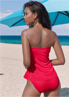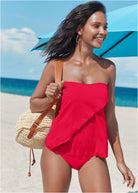 Everyone needs swimwear that's easy to mix and match! Start with chic basics like this flattering, draped bandeau, which features removable straps to fit your desired look. * Detachable and adjustable straps * Built in shelf bra with removable cups * Silicon trim along neckline for extra security * Domestic or import of poly/spandex tricot