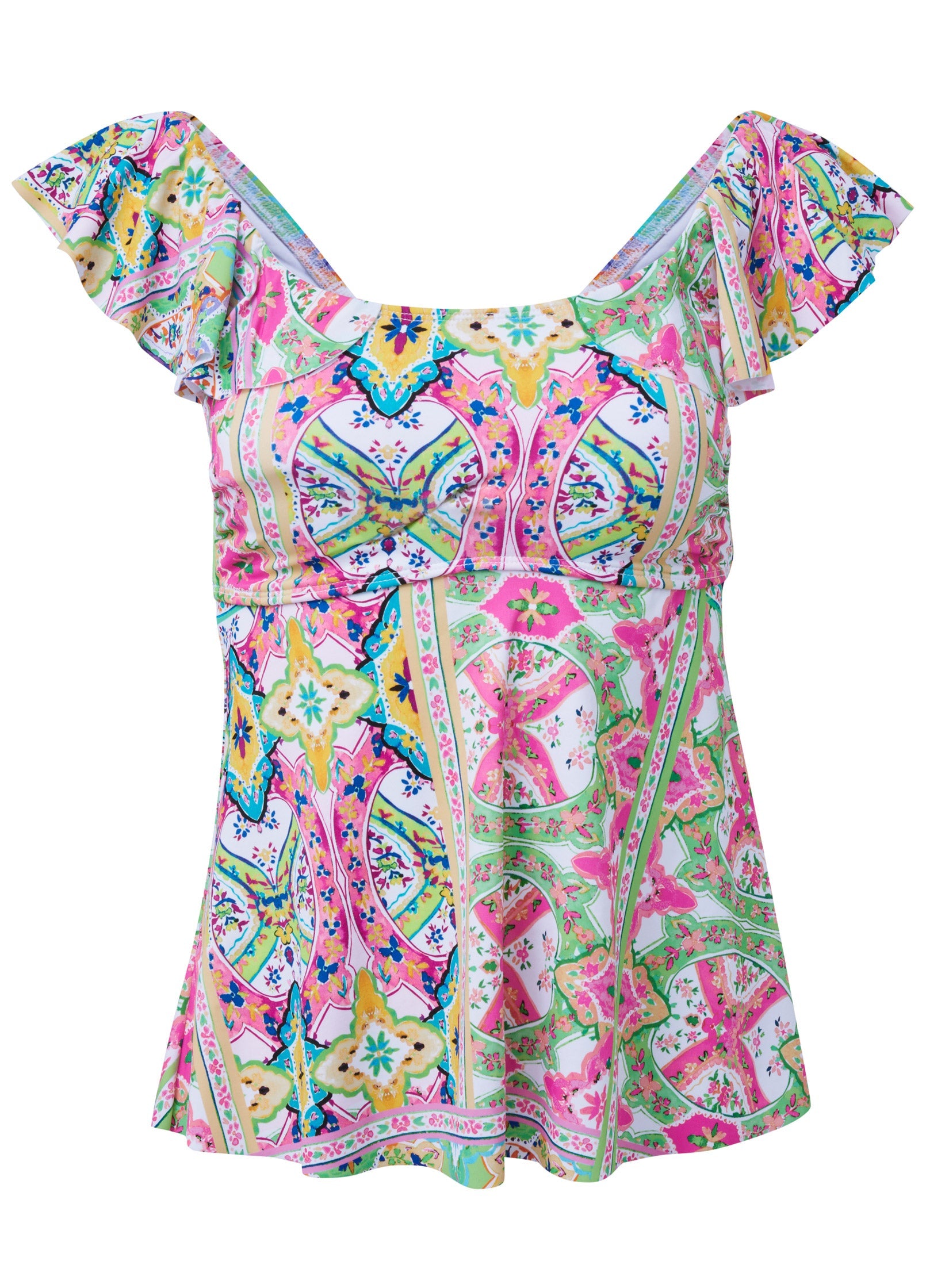Fluttery short sleeves take this tankini top to the flirty side. Sitting over the shoulders to create a scoop front and squared-off back, the ruffled sleeves set this versatile swim top apart. Wear it beach-to-street style as a top paired with denim shorts for off-the-sand adventures!