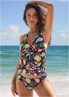 Show off your curves! Hit the beach in this tankini top with a flattering deep-V neck that gives way to ruching at the bodice. The tie at the bustline finishes with beads for a pop of shine that's sure to make you a stand out. Secure the halter neck that gives extra lift and get set to enjoy the sun.