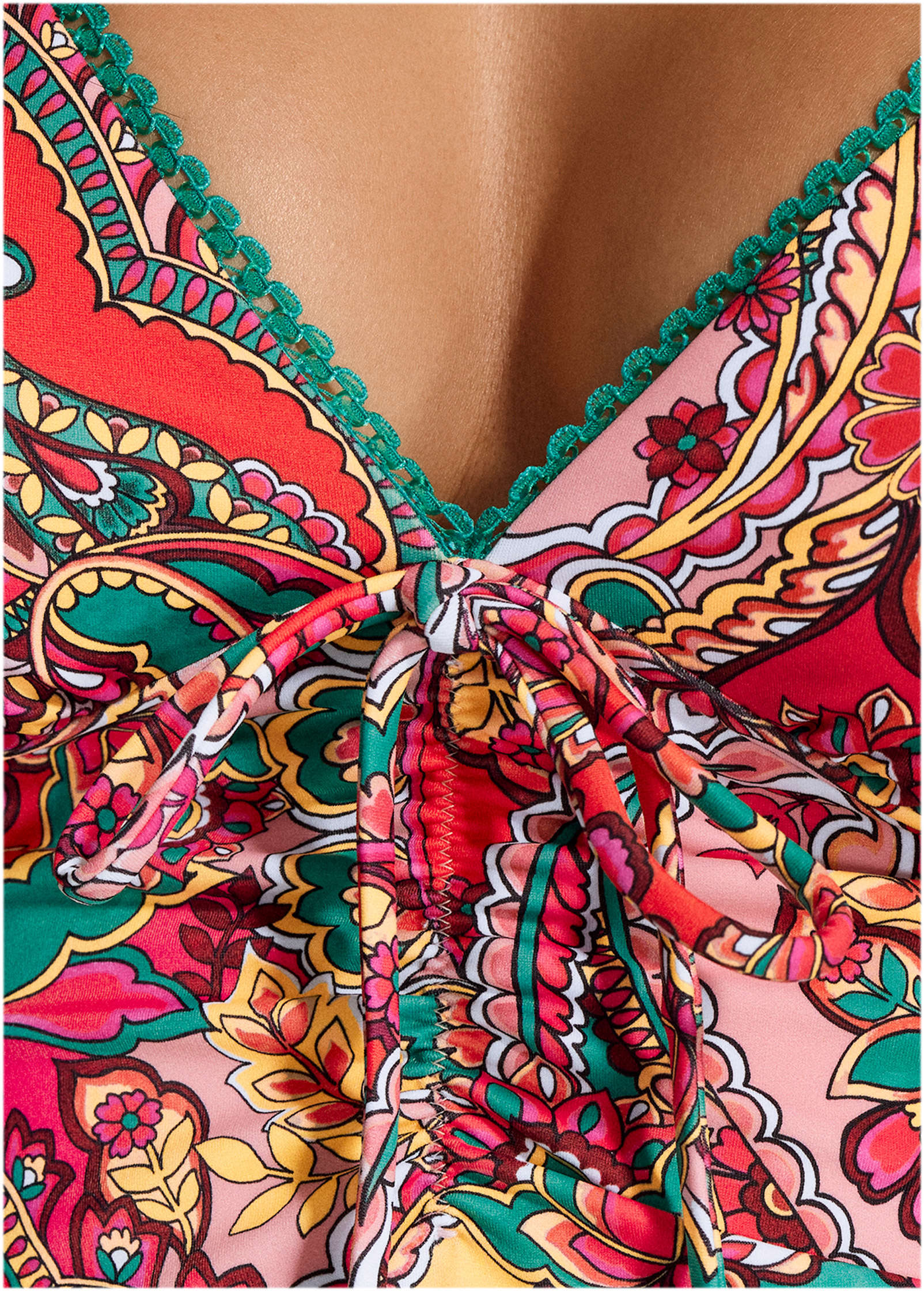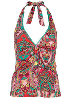 Show off your curves! Hit the beach in this tankini top with a flattering deep-V neck that gives way to ruching at the bodice. The tie at the bustline finishes with beads for a pop of shine that's sure to make you a stand out. Secure the halter neck that gives extra lift and get set to enjoy the sun.