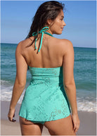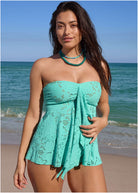 This flirty tankini boasts a sheer, floaty bodice with a draping sash down the front for extra breeziness. Bustline ruching adds fullness to this style that lets you keep the halter strap attached for added support or opt for a strapless look to embrace your sexy side.