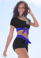 Sporty in its shape but chic with its sash tie front, this short sleeve swim top assures coverage and support for all your warm day activities. Beach games, laps in the pool—anything you love, this sporty piece offers sun protection plus can get wet when it's time to cool off.