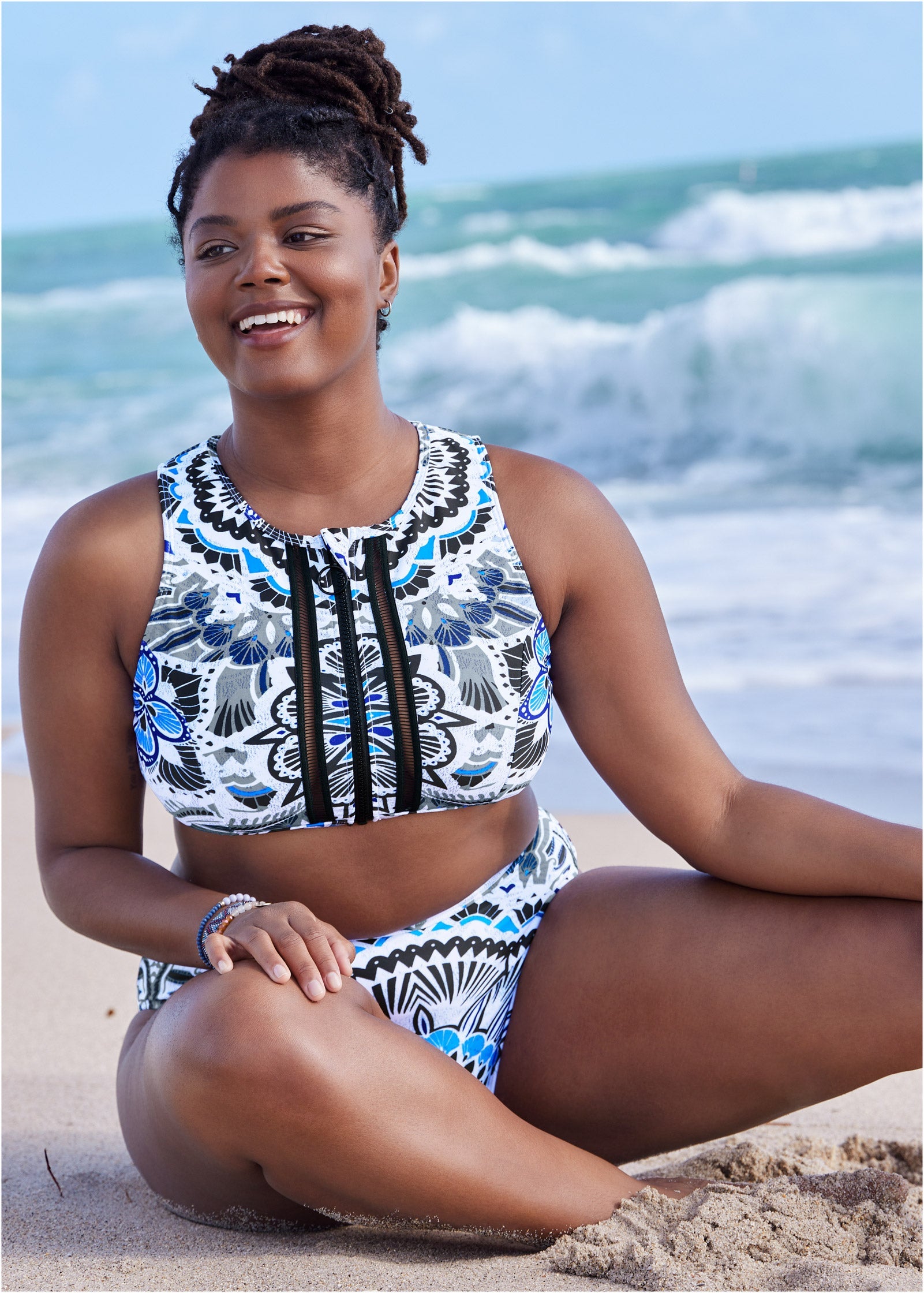 Sporty with a chic twist, this high-neck top features sheer stripes down the front that reveal just enough beneath the fuller coverage. Choose to zip it up all the way during a day of water sports or create a V-neck with the zipper down a little more while enjoying the sun. * Available in plus size * Zipper closure at front * Sheer detail at front * Domestic or import of quality poly/spandex tricot