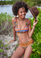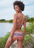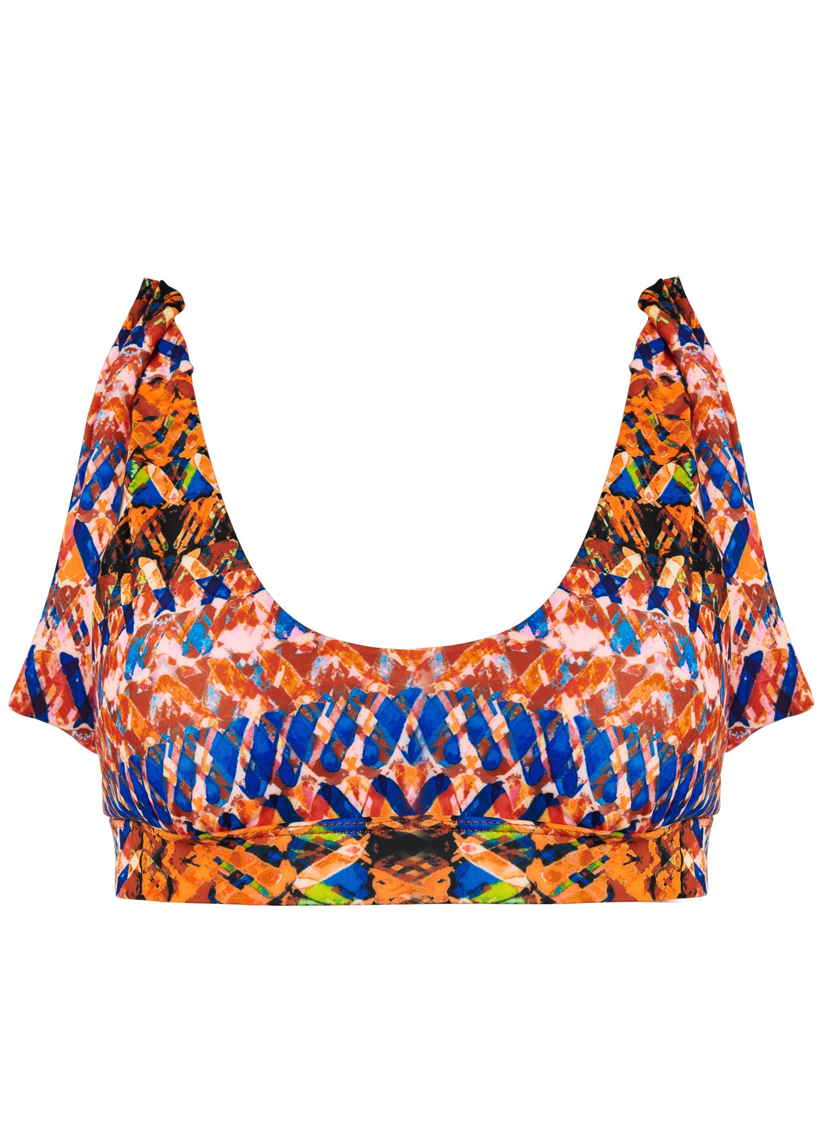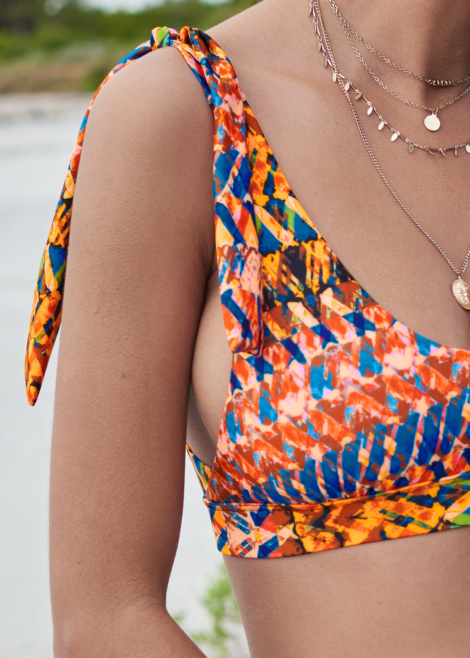 This scoop-neck bikini top serves up one fun and flirty look! From the vivid print to the playful shoulder ties, this suit is guaranteed to earn you compliments on your next beach day. The back band features an adjustable slide to help you achieve your perfect fit.