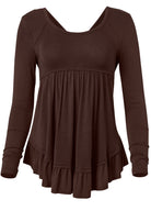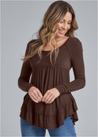 Fitted across the bust but loose and flirty through the bodice, this babydoll top keeps it sweet with long tapered sleeves and a ruffled, asymmetrical hem for added flair. The plunging back brings the sexy edge you love, tying in a bow that finishes the flattering underbust cinching. * Sizes: XS (2), S (4-6), M (8-10), L (12-14), XL (16) * Plus sizes: 1X (18-20), 2X (22-24), 3X (26-28) * Functional tie at back * Easy relaxed fit * 29" approx. length; varies by size * Fabric has stretch * Ecovero viscose/elastane. Imported