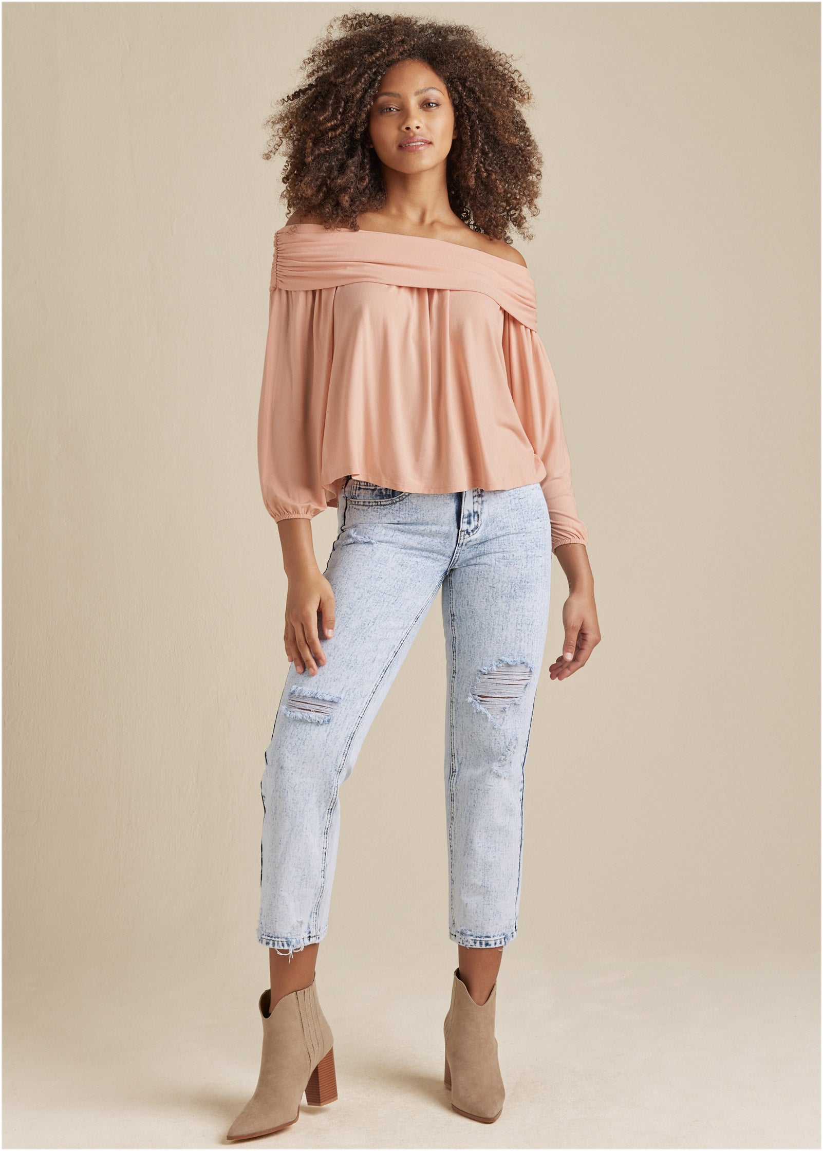 This top is a catch, one you're sure to fall for. Reasons why: 1) The blousy, draped silhouette gives effortless vibes 2) The foldover, off-the-shoulder neckline highlights your décolletage 3) The eye-catching ruched details add a flirty feel. Go ahead and add-to-bag, we're certain it'll be a match.
