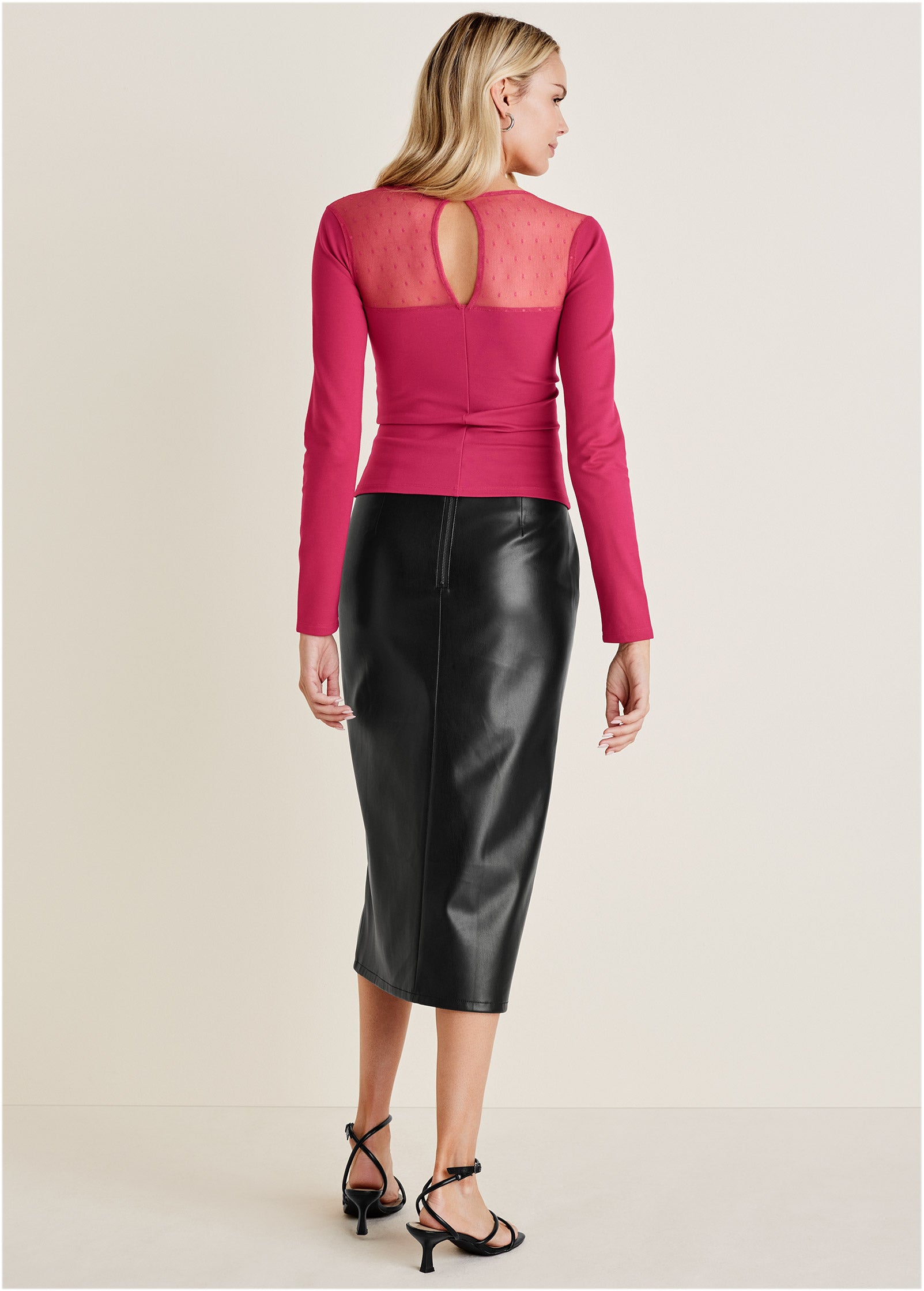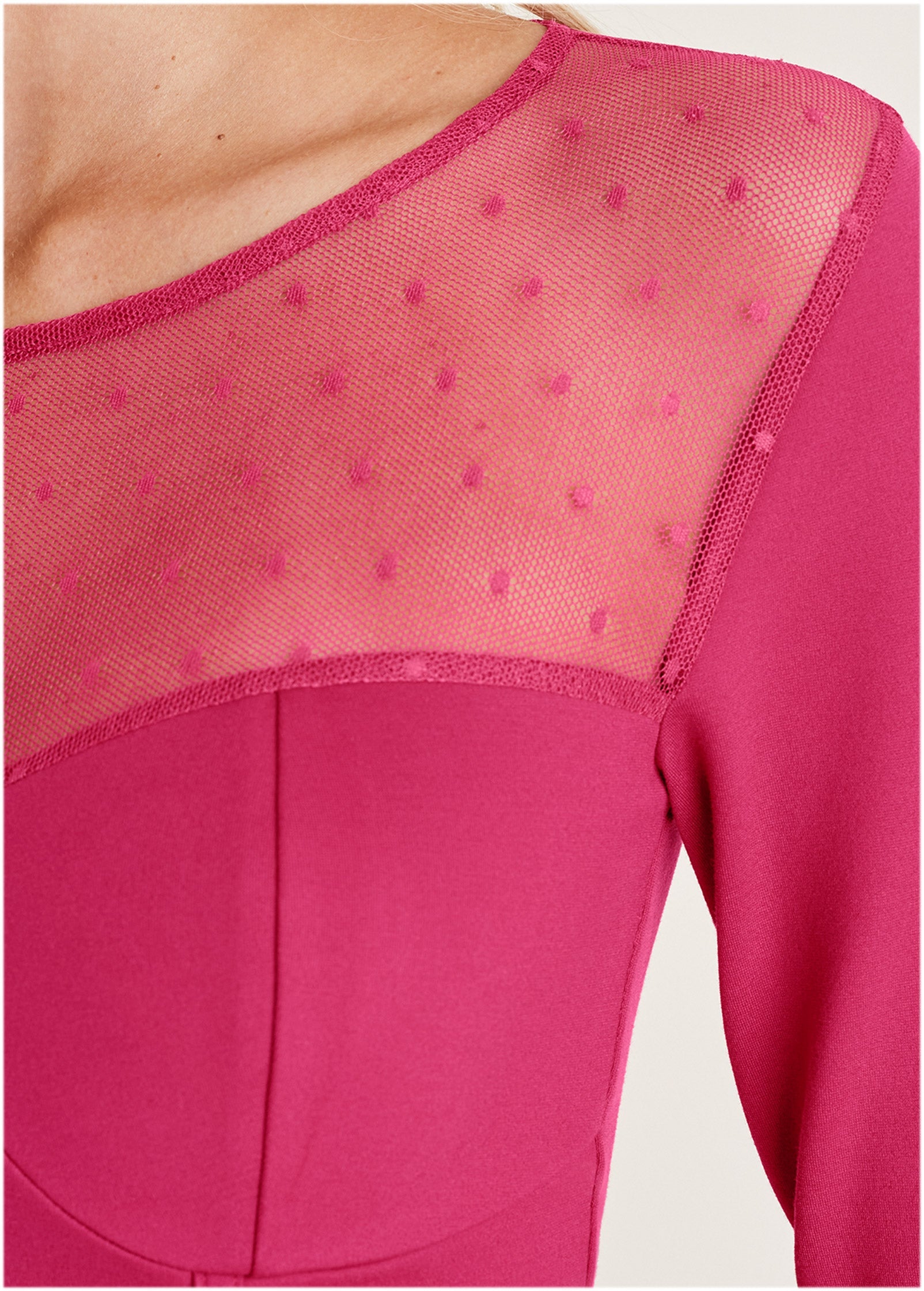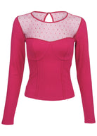 Cover up while showing off in this flirty long-sleeve top. Sheer (and stretchy!) mesh at the neckline offers a peek-a-boo of skin, while the delicate Swiss dot design adds a romantic touch. With a corset-style fit through the body, the comfy stretch fabric hugs your shape, making this a perfect date night top all season long.