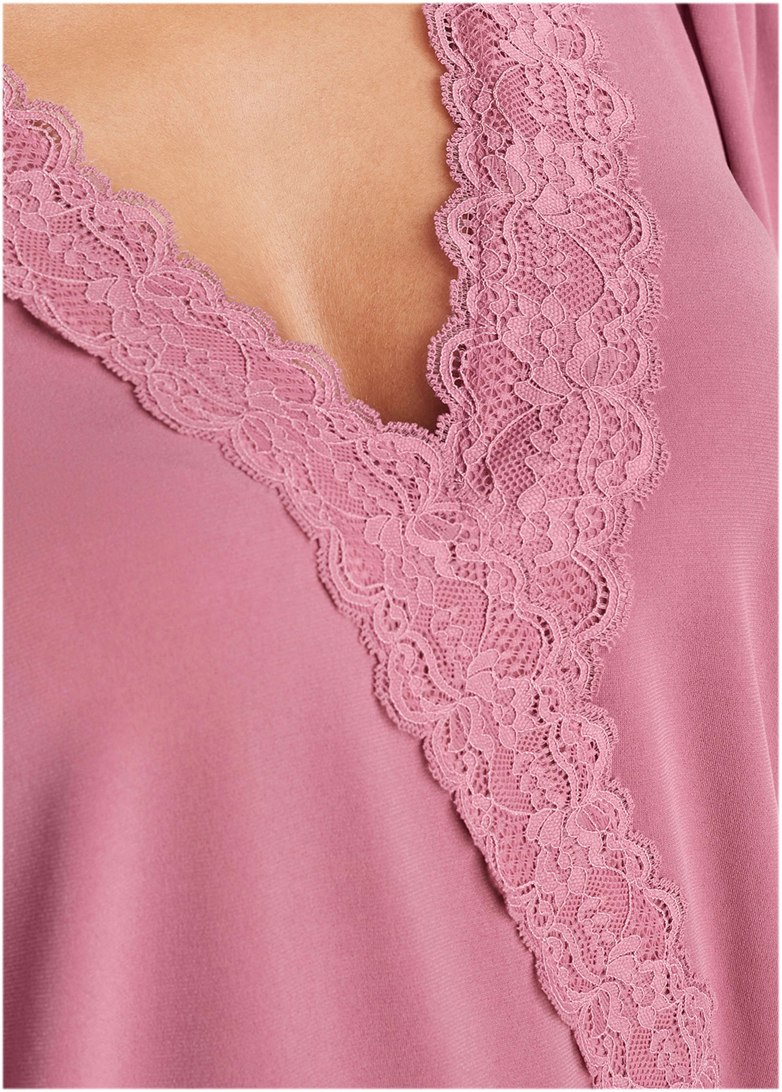 Trimmed in lace, this faux wrap blouse has all the elements you need for total flattery. The faux wrap design drapes effortlessly, creating a loose-flowing silhouette, while lace trim and flowy sleeves add a romantic feminine touch. Complete with an elastic hem, this top gives you the look of a tucked-in top without the fuss.