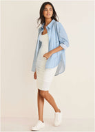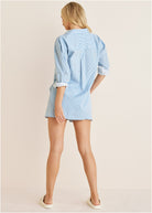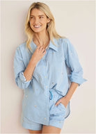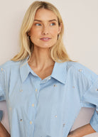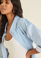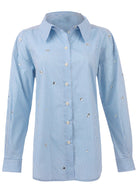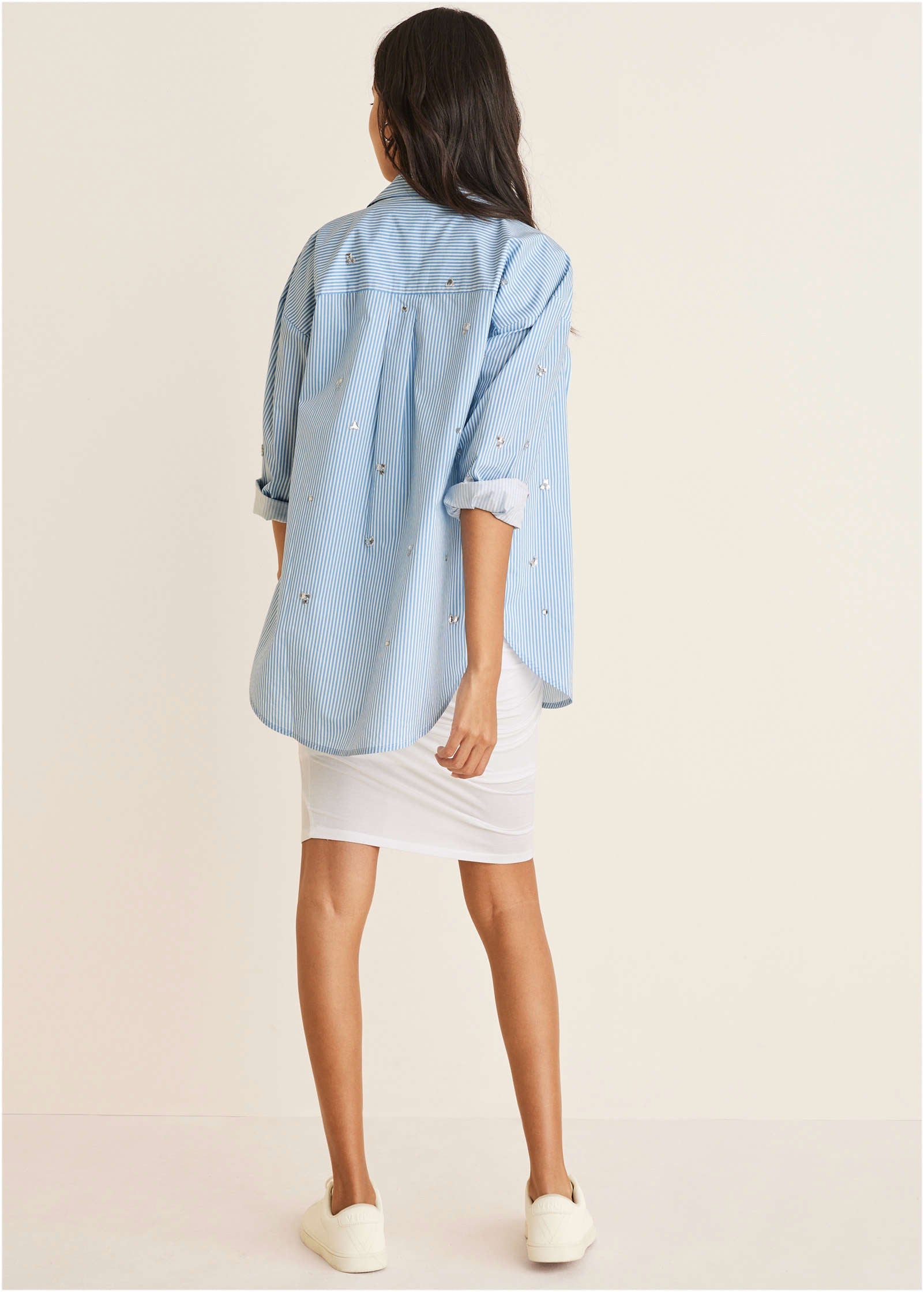 A classic button down with a glam twist? Bling it on! This pinstripe top is covered in sparkling embellishments which makes it equally a statement maker and a staple. Done in our Clean Cut Cotton shirting fabric, it gives clean lines with a crisp, cool-to-the-touch feel. Layer it over a tank dress, style it as a set with our matching Cotton Poplin Shorts—the options are endless.