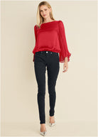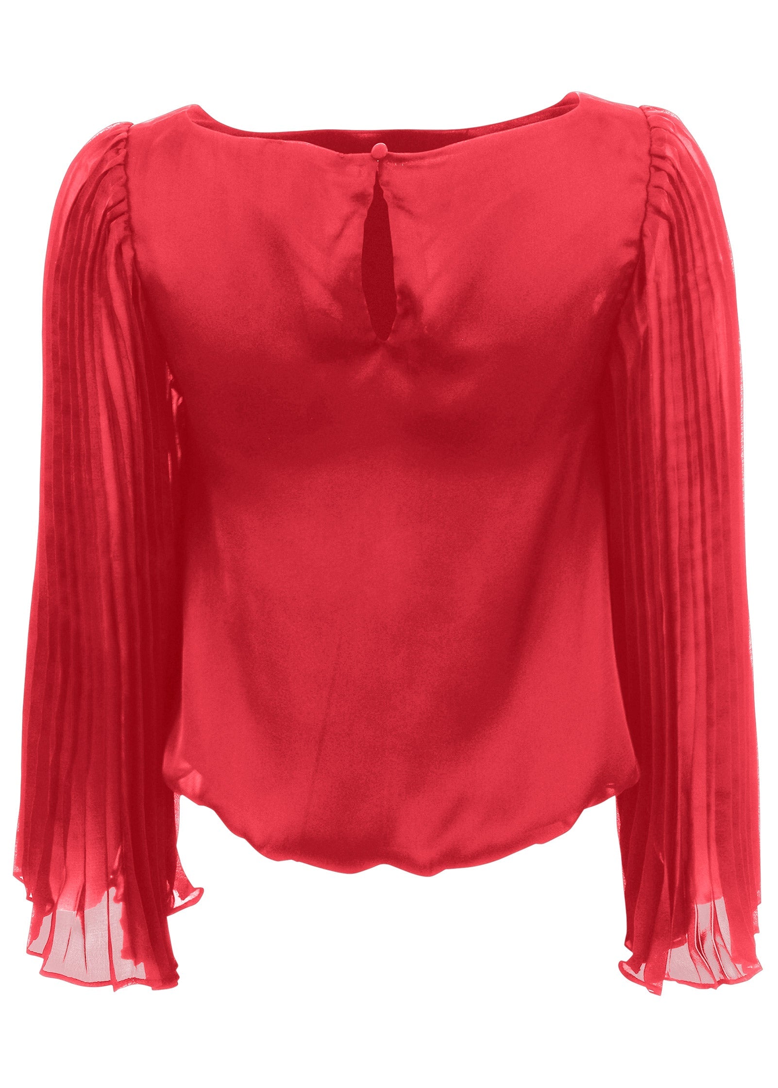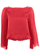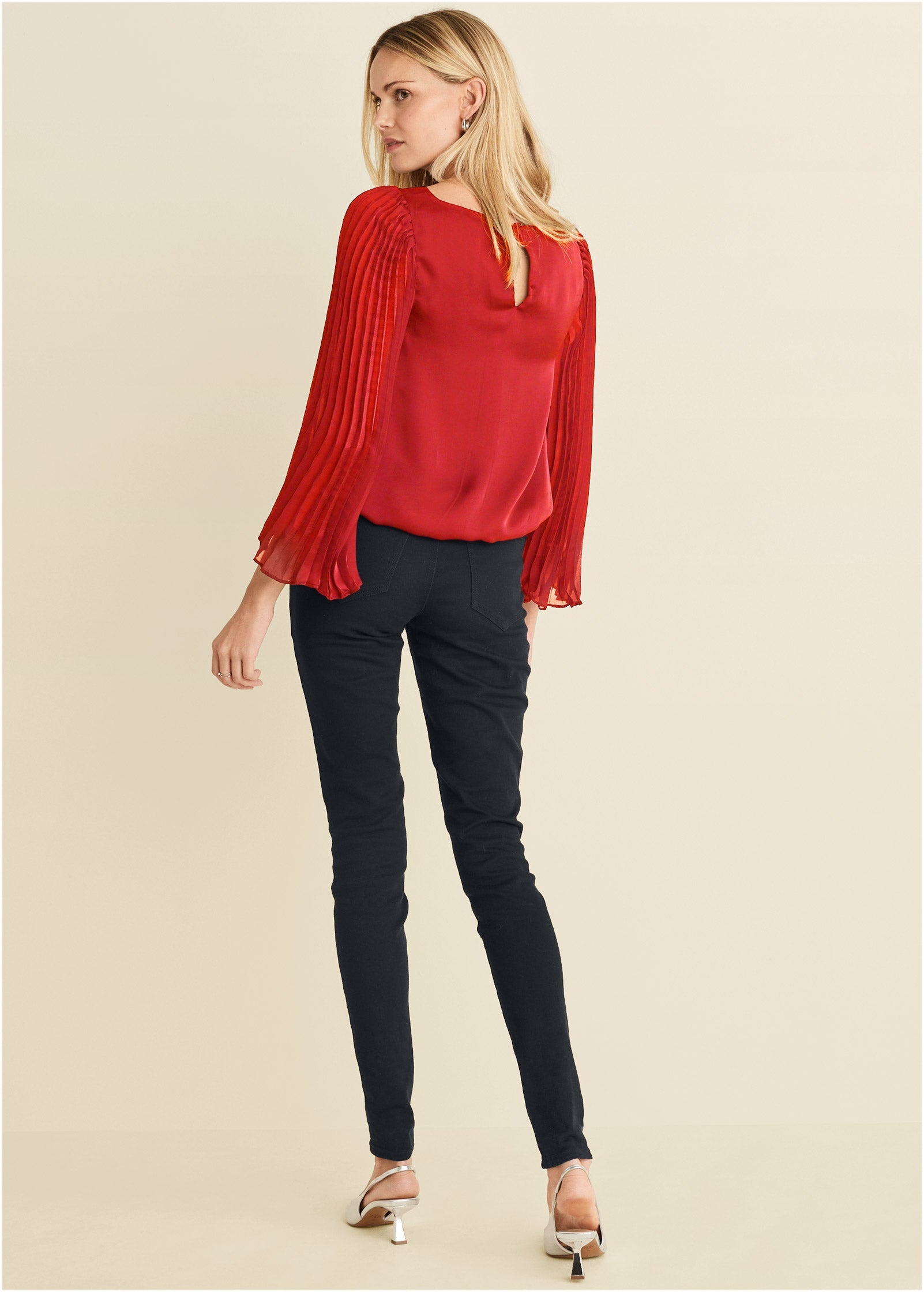 This blouse is the definition of understated elegance. It doesn't have any loud, over-the-top embellishments, but the luxe details speak volumes. Satiny fabric is smooth to the touch, while sheer statement sleeves feature eye-catching pleats that fan out ever so delicately as the floaty fabric moves. In fact, the sleeves are so mesmerizing, don't be surprised if all eyes end up on you. * Runs small; size up for a better fit * 22" approx. length; varies by size * Fabric does not have stretch * Back button closure * Partially lined * Pleated trumpet sleeves * Poly. Imported