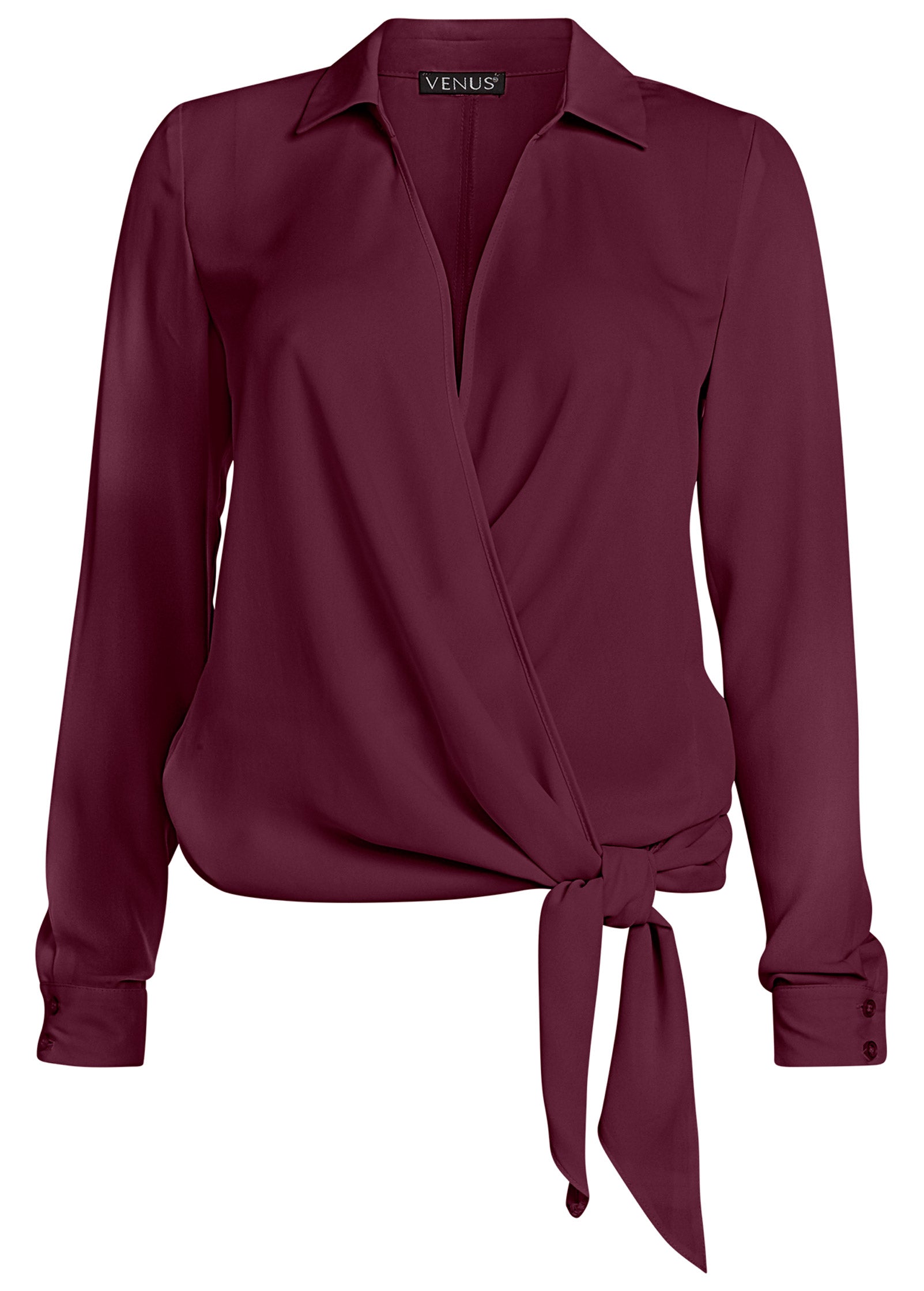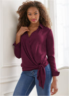 Make your everyday look a little more luxurious with this slightly sexy, definitely chic silky blouse. Collared V-neck and button cuffs give it polished appeal, with a wrapped front that finishes with a knot at the hip for a freshened-up edge. Let a cami or bralette peek out to show your daring side.