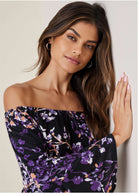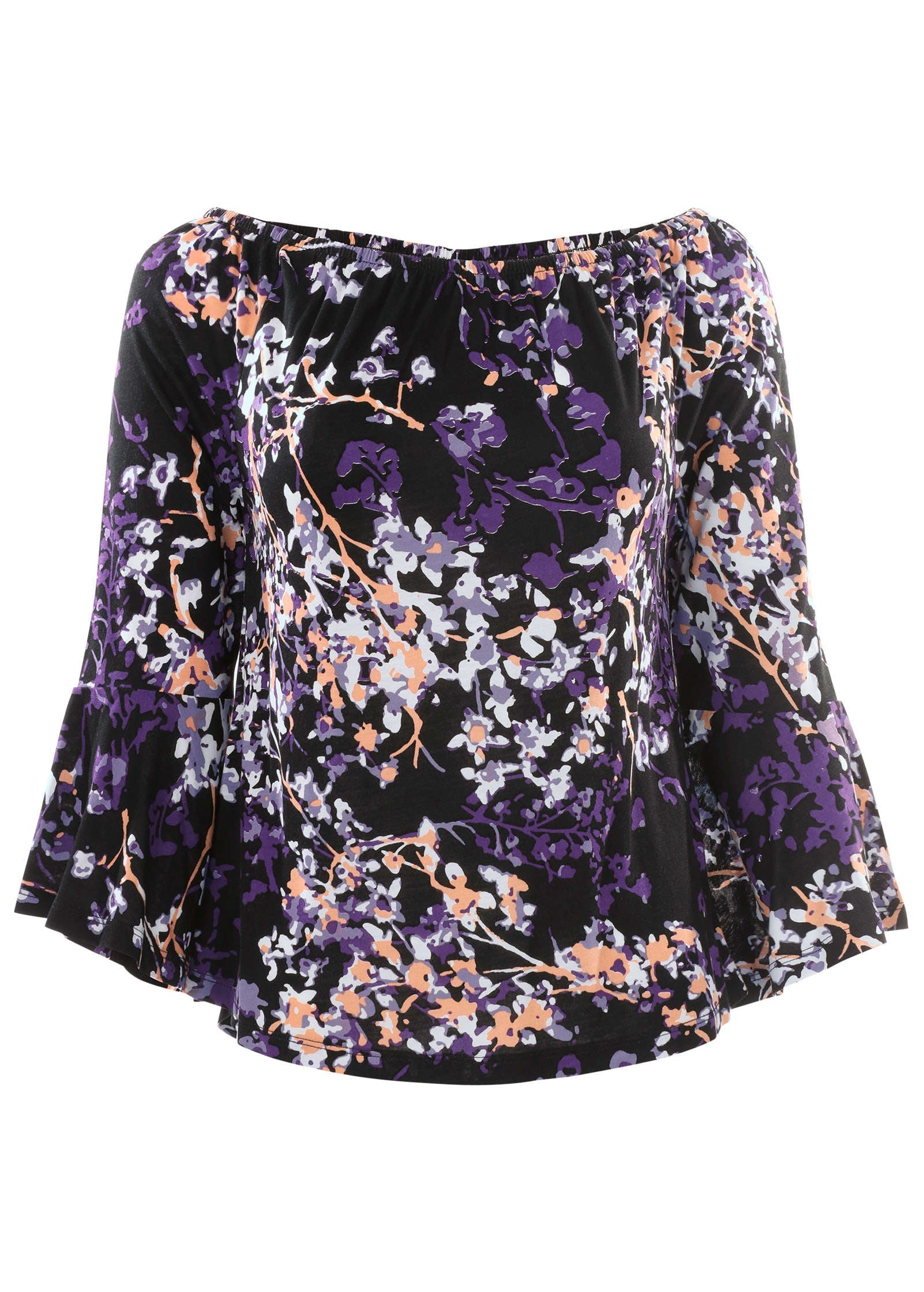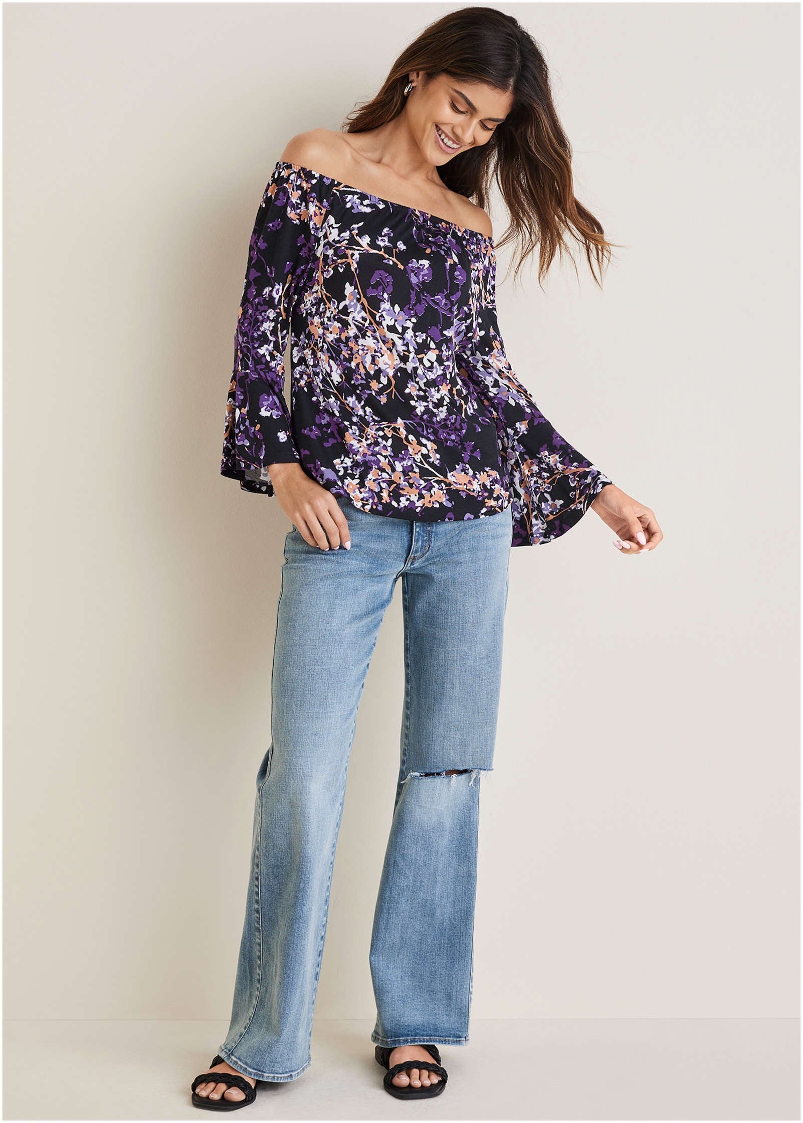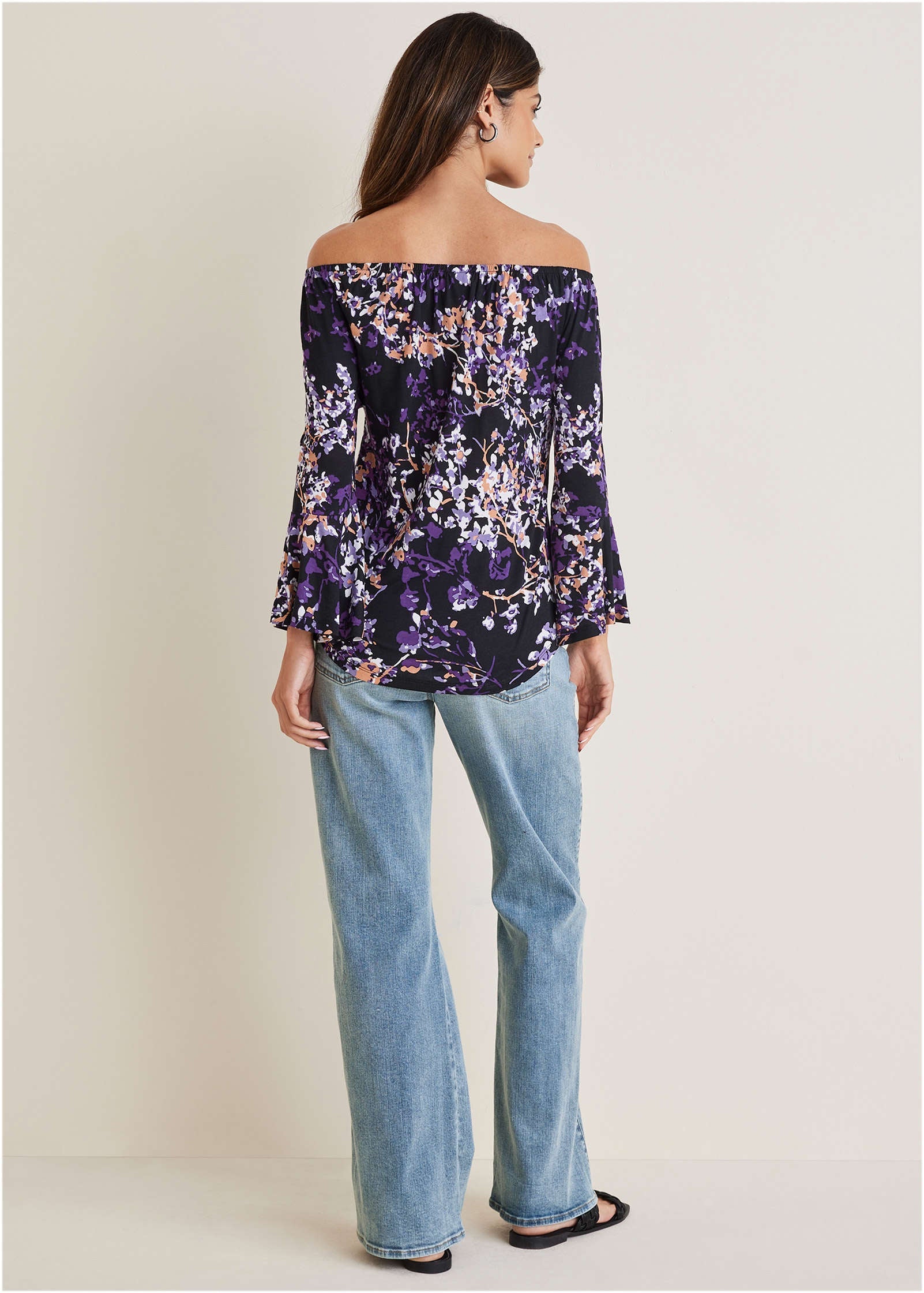 The loose fit hem and billowing bell sleeves bring a breezy vibe to this off-the-shoulder top. Nature-inspired prints enhance this bohemian look that pairs seamlessly with denim for an even more free-spirited flair.
