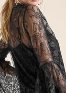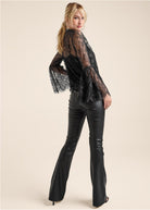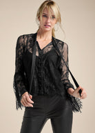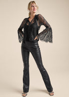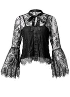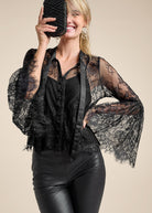 This button-front lace blouse is playfully delicate with its swingy scalloped edges, flouncy bell sleeves and satin bow neckline. Sheer floral lace makes up this cropped-short top, which comes with an adjustable-strap cami lining for coverage where you want it.