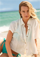 Lightweight, laid-back, and ready for sunshine, this Bahama Knit Shirt is the breezy summer layer you’ll reach for again and again. With a collared neckline and short flowy sleeves, this stretchy knit is all about comfort without sacrificing style. The button-down front lets you wear it open or closed, and the breathable fabric keeps things cool on even the hottest days. Throw it on over your swimsuit for poolside polish, or pair it with denim cutoffs for an effortlessly cool vacation vibe. From the beach to brunch, this shirt’s got your back. * Sizes: XS (2), S (4-6), M (8-10), L (12-14), XL (16) * Collared neckline: A classic touch that elevates this casual fave. * Short flowy sleeves: Keep it light and airy. * Fabric has stretch: Moves with you for all-day comfort. * Button closure: Style it open over swim or buttoned up with shorts. * Breezy knit fabric: Lightweight and perfect for warm weather. * Poly/spandex. Imported