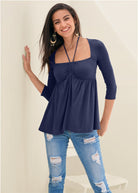 This 3/4-length sleeve top can be worn two chic ways! At the center of the square neckline is an adjustable drawstring that can be tied as a center bow for a more casual look, or tied halter-style behind the neck for a more flirty vibe. Pair this babydoll top with your favorite jeans for an easy-chic everyday look * Sizes: XS (2), S (4-6), M (8-10), L (12-14), XL (16) * Plus sizes: 1X (18-20), 2X (22-24), 3X (26-28) * Square neckline * Adjustable drawstring at neck * Ruching at bust * 3/4 sleeves * Ecovero viscose/spandex. Imported