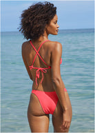 Consider this the classic triangle top 2.0. It has the same timeless shape, but with double strings under the bust and ties that crisscross in back. And that's not all: done in our textured Honeycomb fabric, it's ultra-stretchy and snug, flexing to fit and flatter. Once you feel how soft it is, you won't be able to stop buzzing about it!