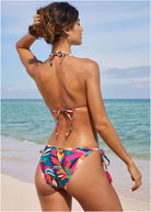 A refresh to the forever-sexy triangle top, this halter-neck bikini features contrasting, diamond-shaped stitching along the cups for a pop of interest. The elevated look was made for trips to the tropics and dips in the pool, securing easily behind the neck and back with spaghetti ties!
