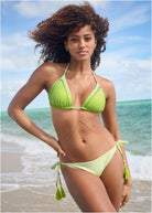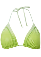 Take the classic triangle bikini top to chic new places! The trendy wet-look fabric that defines this bikini top has a sheen that assures you stand out. Contrasting diamond stitching adds a pop of interest to the cups, making this packable piece instantly getaway-ready. * Removable shaping cups * Spaghetti ties at neck and back * Diamond stitch embroidery at cups * Wet-look shiny fabric * For printed items; placement may vary * Domestic or import of poly/spandex tricot