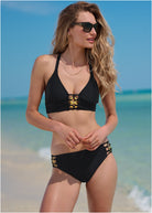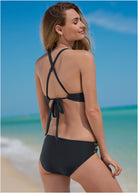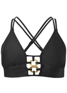 Amped up with metallic ring details secured at the wide center-front cutout, this bikini top offers support with its V-neck and wide band under the bust for a beach-day pick that shines. Double shoulder straps crisscross then loop through the back and tie for an adjustable fit that flatters and lifts.