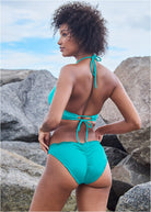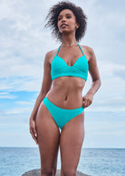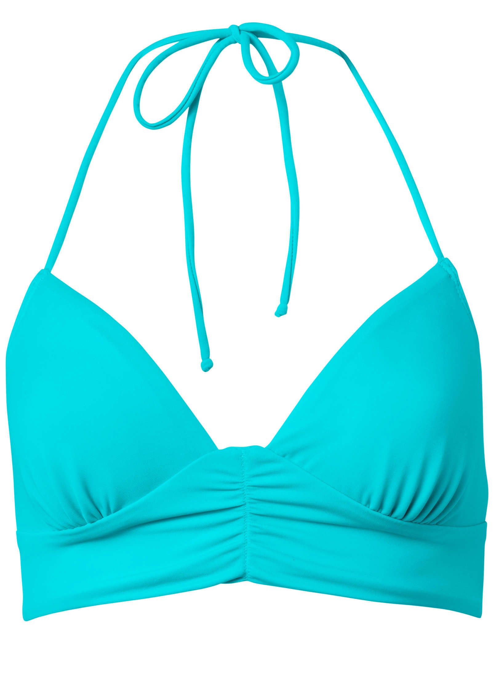 Your favorite triangle bikini silhouette gets a bit of an upgrade with this feminine take featuring a wide band under the bust with flirty gathers that draw in the eye. A spaghetti tie loops through the back and adjusts until you find your perfect fit, assuring all-day comfort.