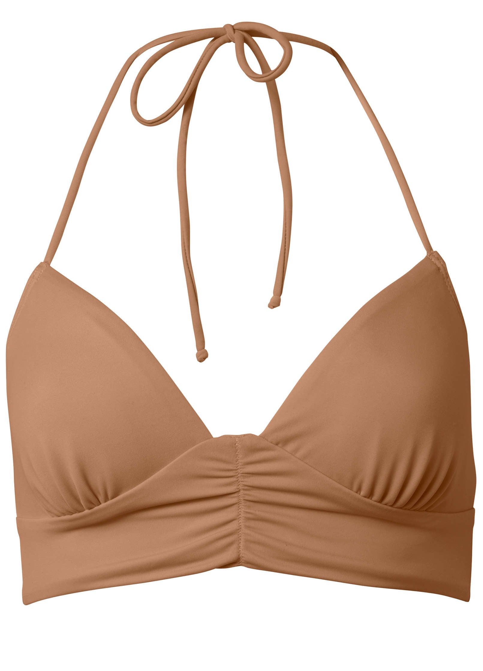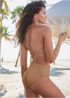 Your favorite triangle bikini silhouette gets a bit of an upgrade with this feminine take featuring a wide band under the bust with flirty gathers that draw in the eye. A spaghetti tie loops through the back and adjusts until you find your perfect fit, assuring all-day comfort.