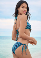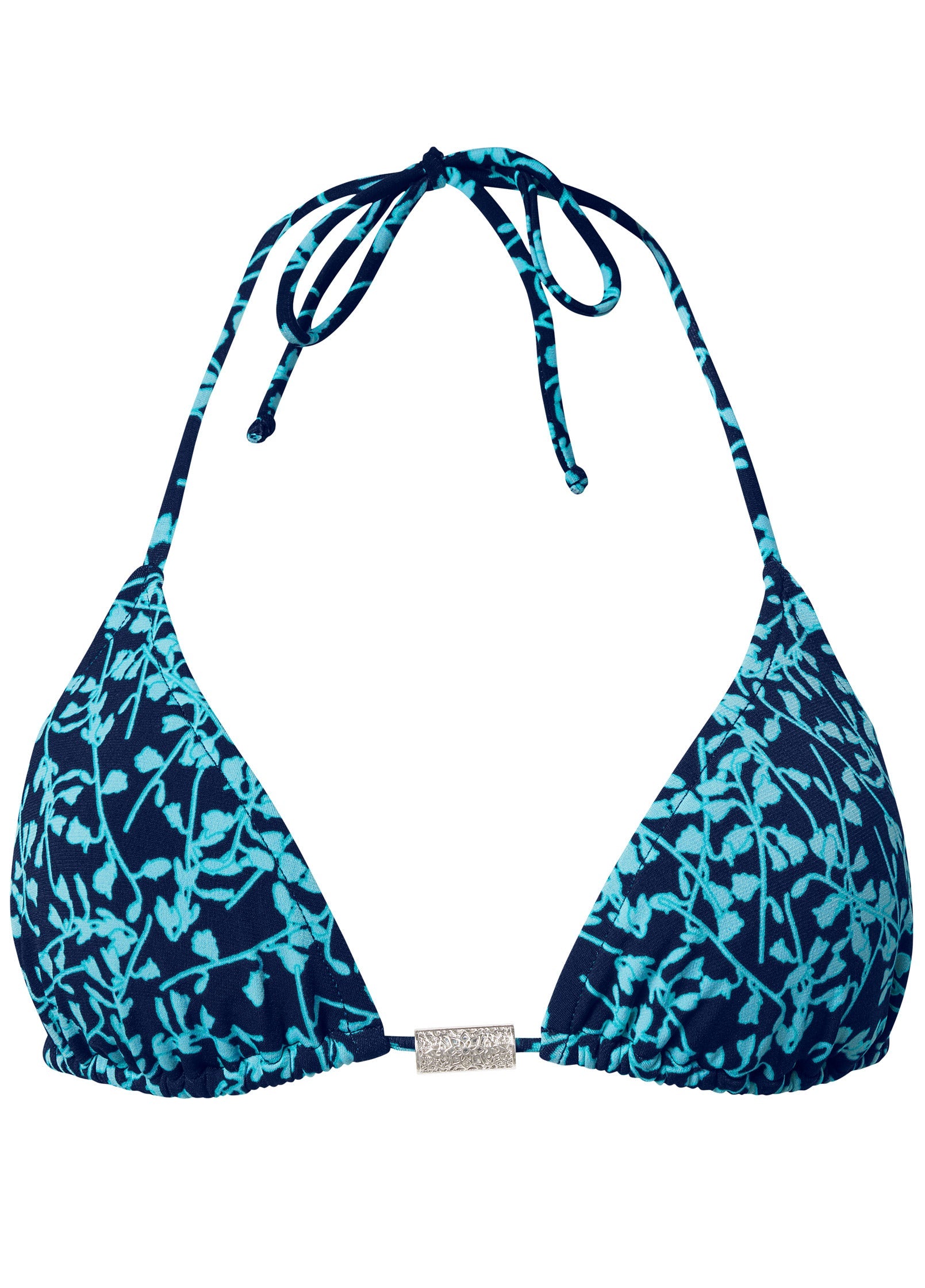 The textured metallic detail along the strap of this triangle bikini brings a luxe bit of edge to the center front of this ever-stylish and flattering silhouette. Adjust the halter and back ties to fit to your figure, then pair with coordinated bottoms to complete the bikini for tropical trips!