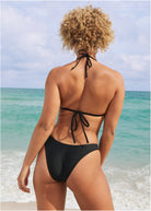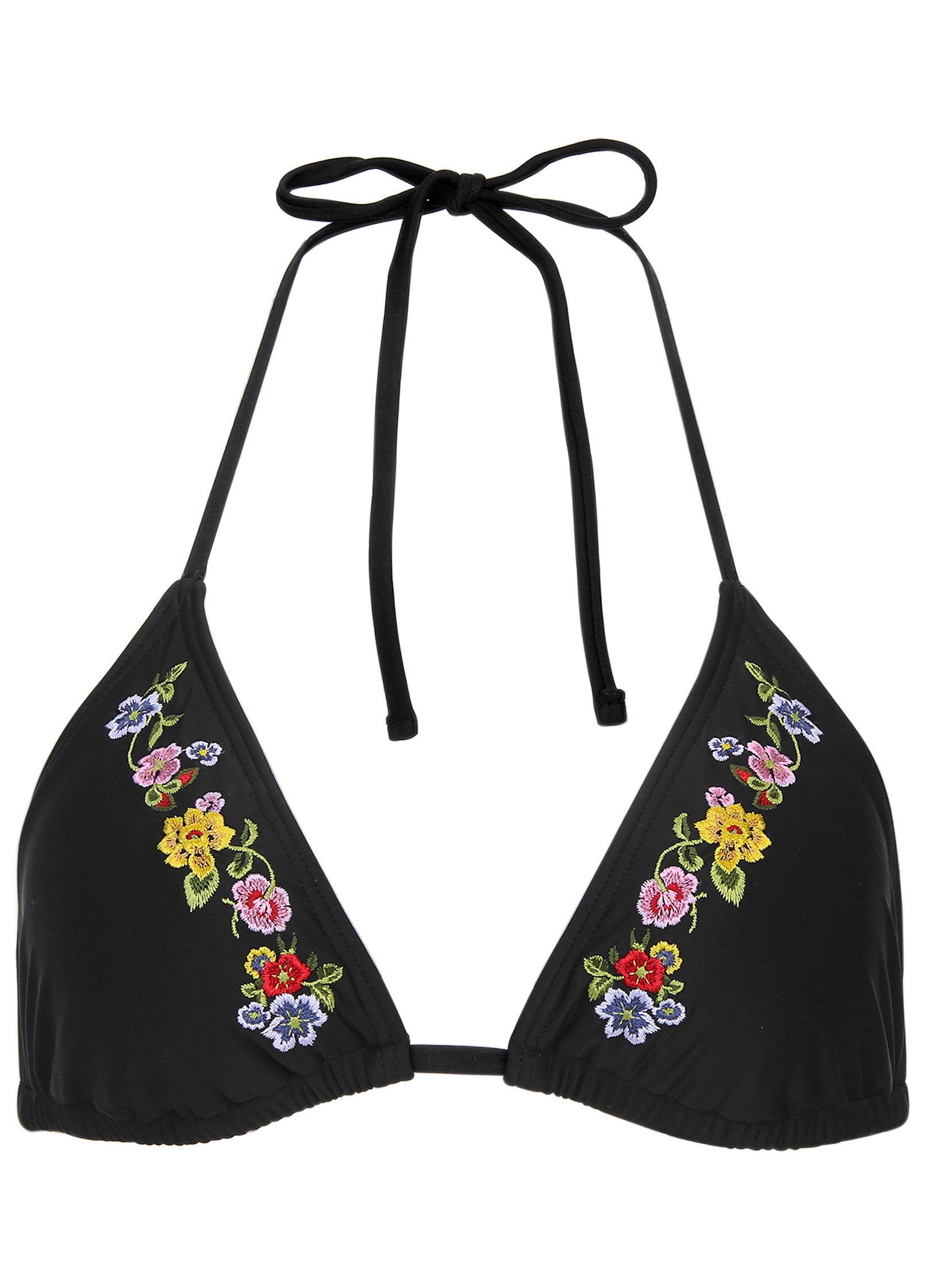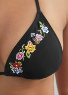 Floral embroidery gives this little black bikini top a romantic twist. Between the vibrant colors and intricate details, the woven design looks hand stitched. Pair this triangle top with our matching Embroidered Scoop Bottom to go all in on the embroidered look.