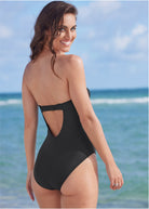 Amp up your one-piece look with a sparkly, embellished ring! Its bandeau-style neckline with gathers pulled in by the blingy detail at the center front make this swimsuit a sunny-day standout. The low-cut back secures with an adjustable strap for just enough coverage.