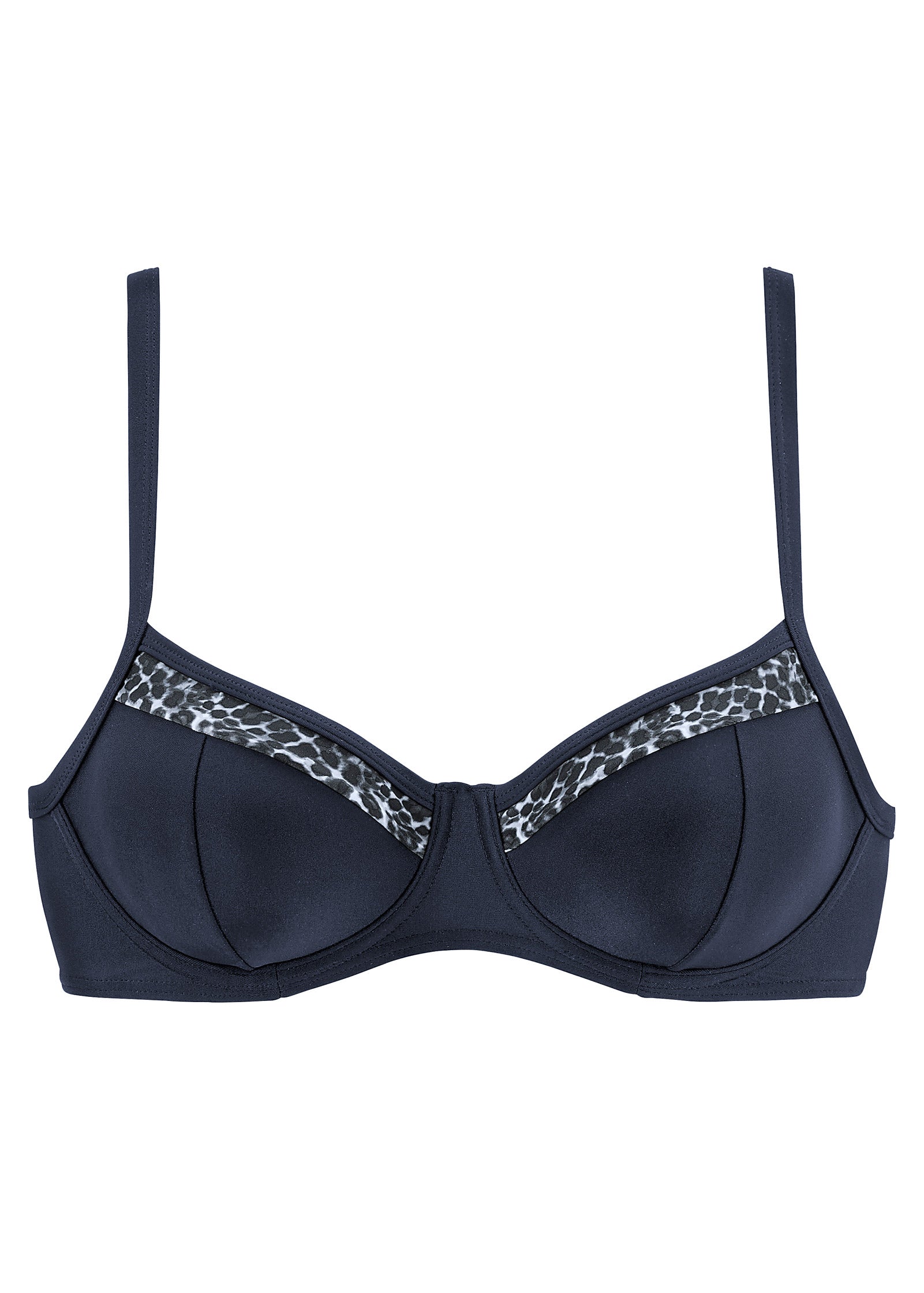 With an underwire for extra support on long days in the sun, this structured bikini top delivers sleek beachside style with padding to smooth it out. Vertical seams flatter the bust with a strip of printed trim along the upper edge that makes it pop! Adjustable straps keep it secure all day.