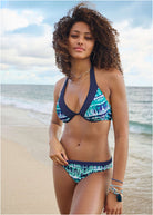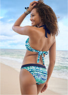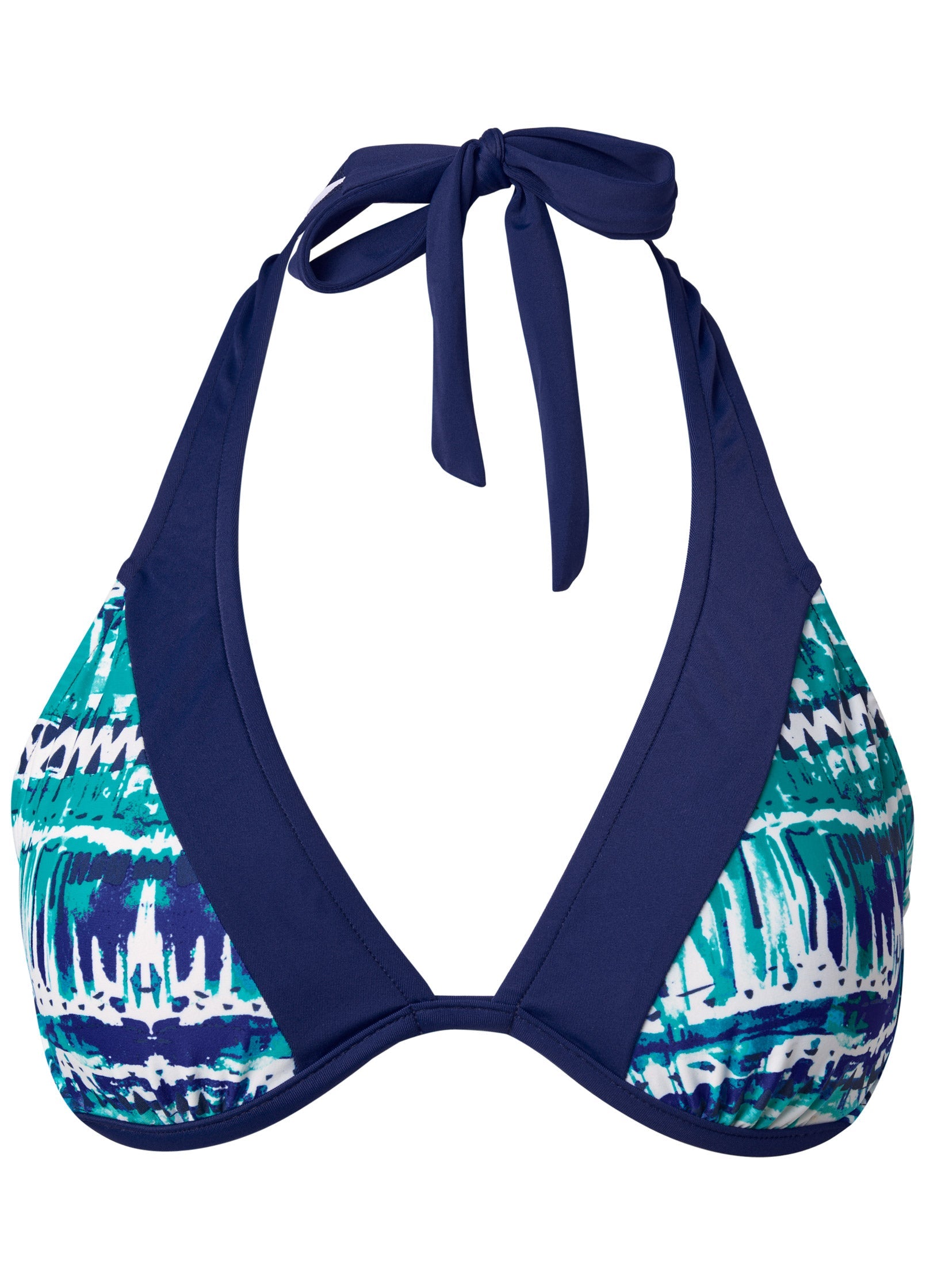 Dive into this classic halter-style bikini top for a timeless beach look. An underwire offers support, while wide straps comfortably tie around the neck to offer extra lift. With no padding, this top is a perfect choice for those who prefer a more natural look. * Underwire support * Comfortable sashes tie behind neck * For printed items; placement may vary * No padding or cups * Some colors of this style are made of recycled fabric. For more information, see MORE DETAILS * BHV: Domestic or import of recycled nylon/spandex tricot * CTB: Domestic or import of poly/spandex tricot * All Other Colors: Domestic or import of nylon/spandex tricot