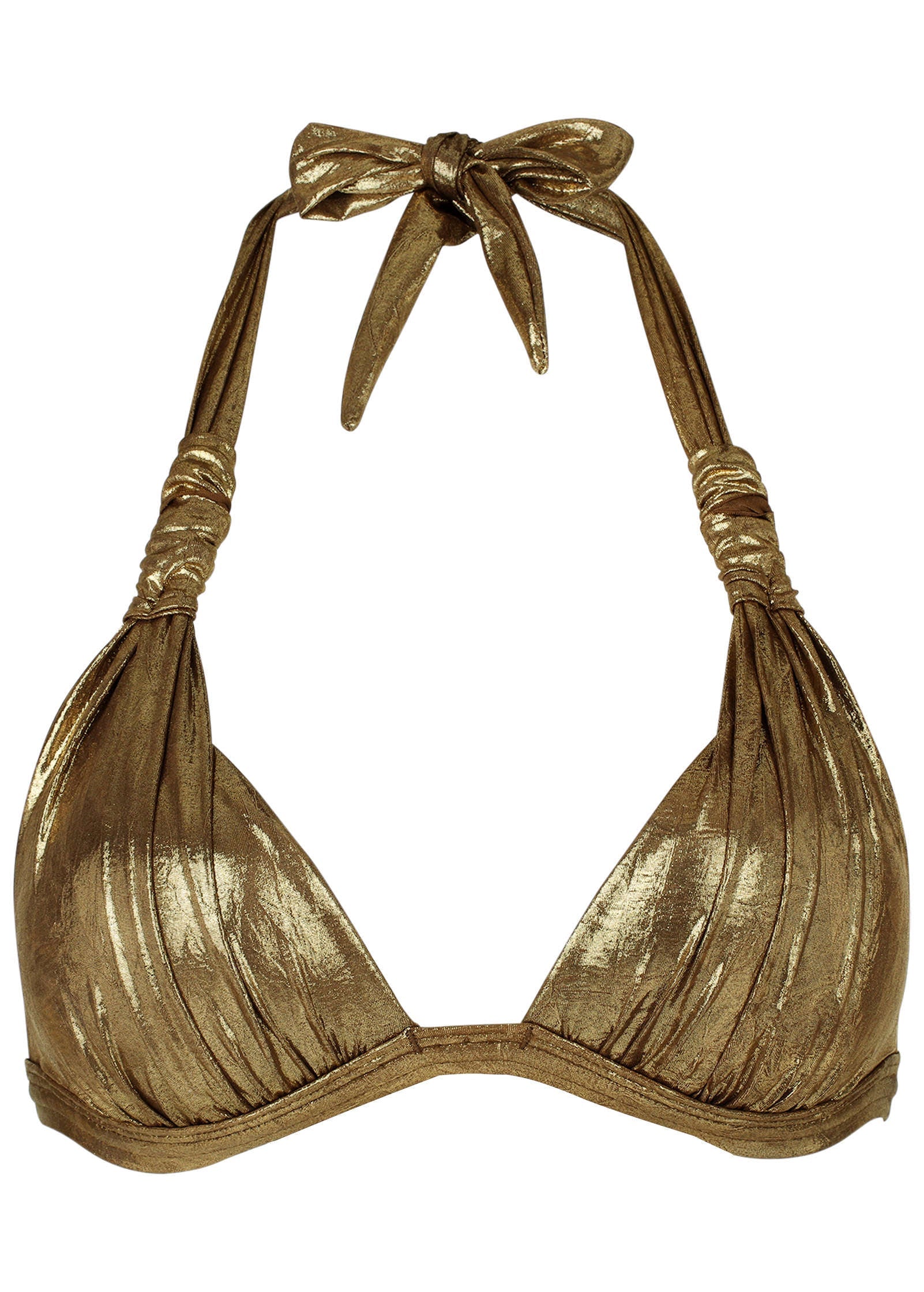 Our cult-favorite bikini top is now as good as gold! The Goddess top has been a best seller for over ten years and is still going strong as a fan-favorite. Why? It gives beach days a serious boost! Molded cups with push-up padding offer extra oomph—more than any of our other bikini tops. This metallic take offers a glam spin on a timeless beach day style.