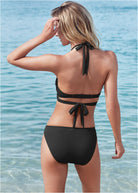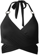 This bikini top has a secret: a hidden underwire! Get the sleek look of a wrap top but with extra shaping and support built into the cups. Ring hardware at the front of the straps plus two adjustable bands in the back give a cool edge to the flattering fit.