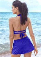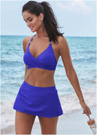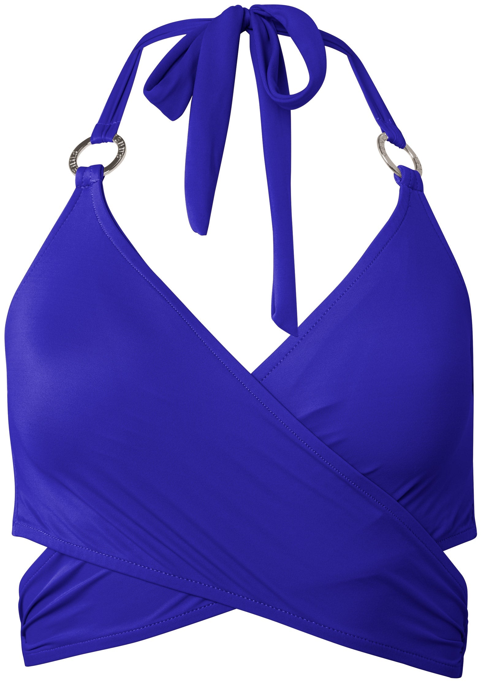 This bikini top has a secret: a hidden underwire! Get the sleek look of a wrap top but with extra shaping and support built into the cups. Ring hardware at the front of the straps plus two adjustable bands in the back give a cool edge to the flattering fit.