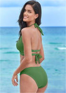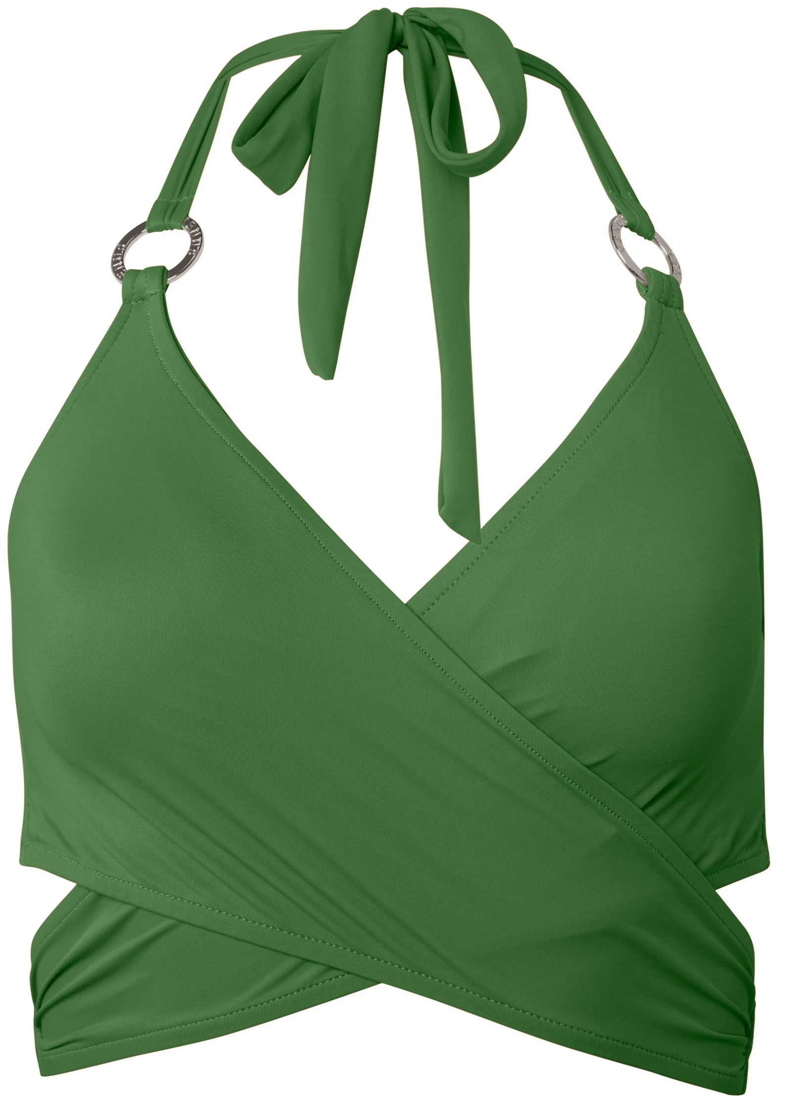 This bikini top has a secret: a hidden underwire! Get the sleek look of a wrap top but with extra shaping and support built into the cups. Ring hardware at the front of the straps plus two adjustable bands in the back give a cool edge to the flattering fit.