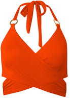 This bikini top has a secret: a hidden underwire! Get the sleek look of a wrap top but with extra shaping and support built into the cups. Ring hardware at the front of the straps plus two adjustable bands in the back give a cool edge to the flattering fit.