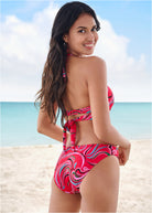 This bikini top has a secret: a hidden underwire! Get the sleek look of a wrap top but with extra shaping and support built into the cups. Ring hardware at the front of the straps plus two adjustable bands in the back give a cool edge to the flattering fit.