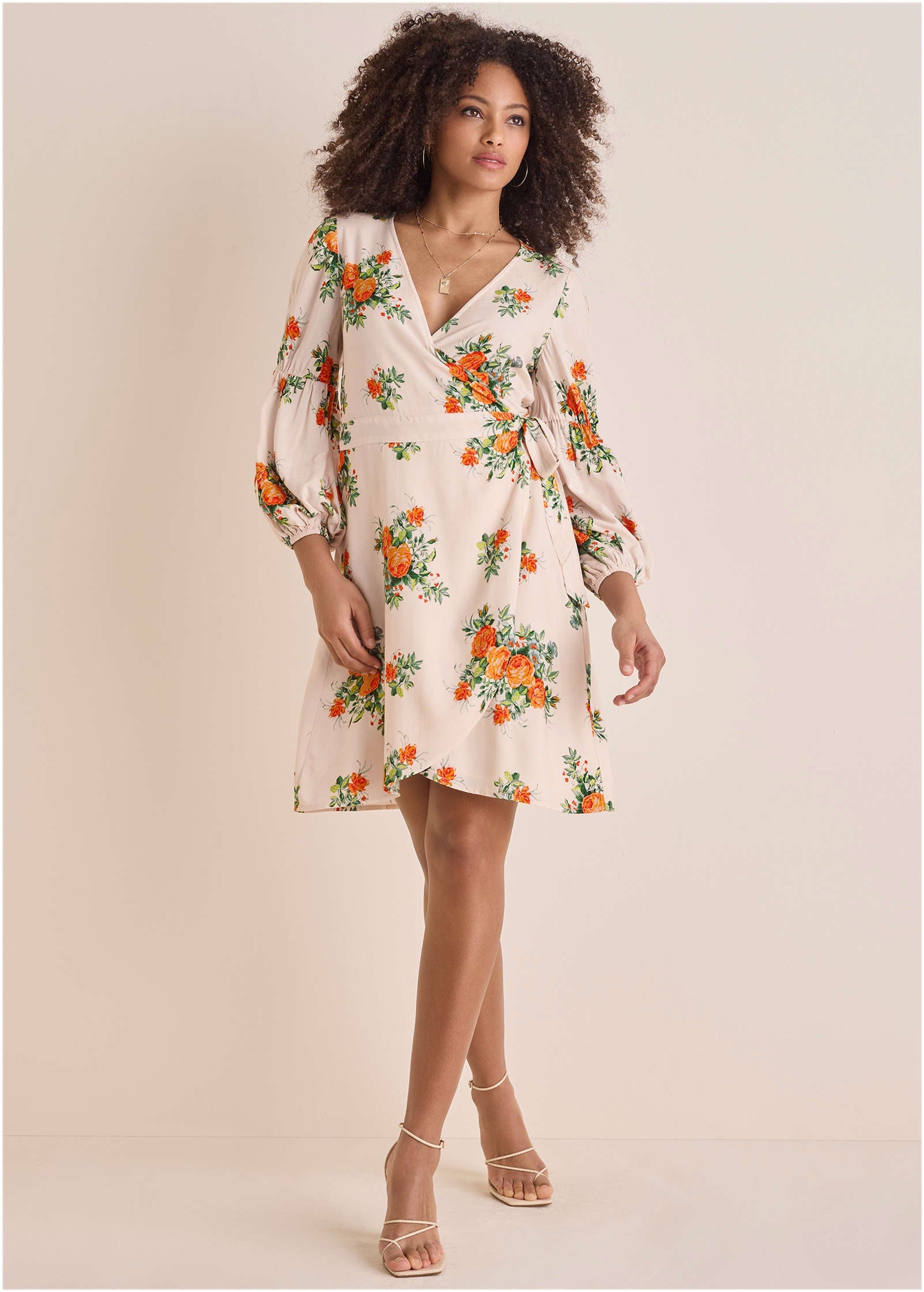 This printed wrap mini dress features a V-neckline, long sleeves, and a flattering waist tie that cinches your waist. The mini length adds just the right amount of flirty flair. * Sizes: XS (2), S (4-6), M (8-10), L (12-14), XL (16) * Plus sizes: 1X (18-20), 2X (22-24), 3X (26-28) * Wrap style: A figure-flattering design that hugs your curves. * V-neckline: A flattering cut that adds a touch of elegance. * Long sleeves: Ideal for transitional weather while still feeling light. * Waist tie: Cinches at the waist for a defined silhouette. * Mini length: Show off your legs in a fun, flirty way. * Viscose. Imported