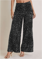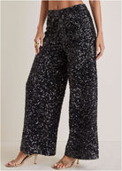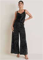 Pour on the sparkles and dial up the glam because these pants came to party! Soft stretch velvet is covered in allover sequins that glisten with every move this swingy wide-leg pair makes. Style them with a black top—a satin tank for evening or a cozy sweater by day—for a monochromatic look that's equal parts modern and festive. * Sizes: XXS (00-0), XS (2), S (4-6), M (8-10), L (12-14), XL (16) * Plus sizes: 1X (18-20), 2X (22-24), 3X (26-28) * Available in petite sizes * Mid rise * Wide legs * Inseam: 31" missy; 29" petite * Polyester/spandex. Imported