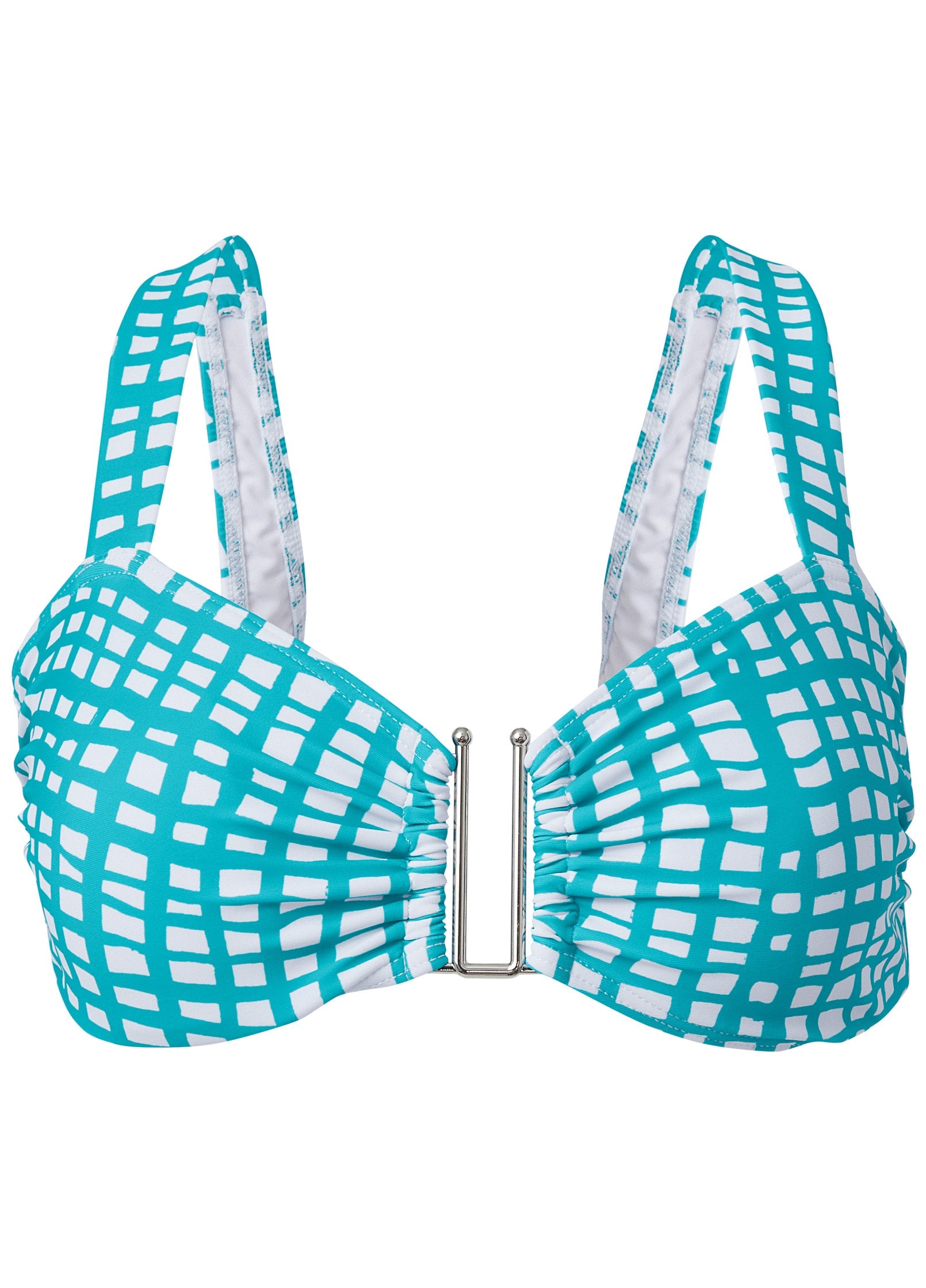 Pretty meets practical in this bralette-style push-up bikini top, boasting a sweetheart shape that's centered with a plunging metal detail. The wider over-the-shoulder straps scoop in the back for a stay-in-place fit, leading to an adjustable sash tie closure. * Shoulder straps * Removable molded cups * Metallic front detail * Tie back closure * Domestic or import of poly/spandex tricot