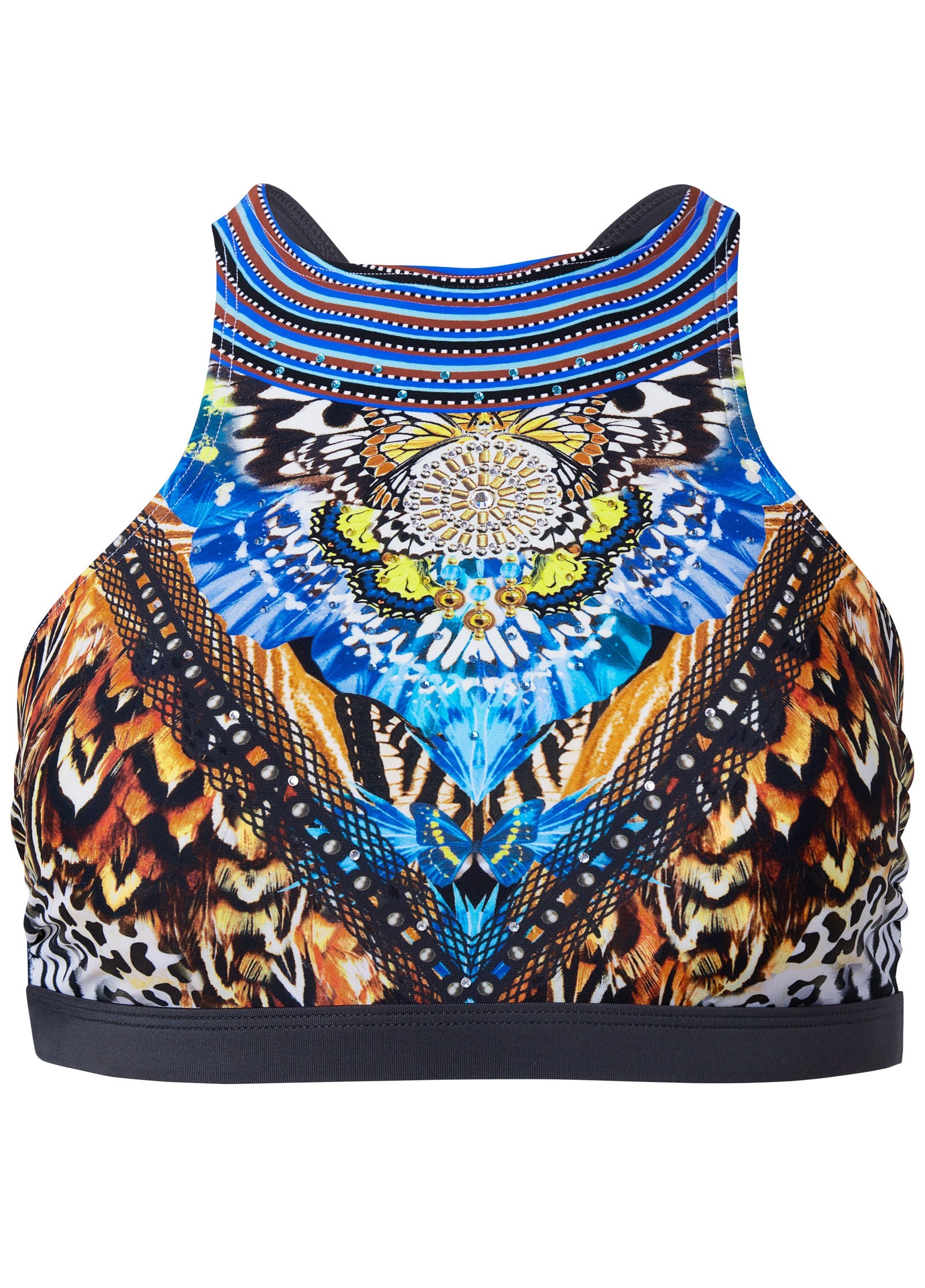 From play to vacay, this sport top takes you through the sunny-day activities you love! The high-cut neckline assures coverage in the front while crisscrossed back straps and underbust band add extra support. Enjoy a game of volleyball, a bike ride through the sand, or a dip in the waves without worry.