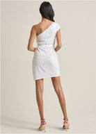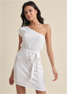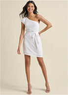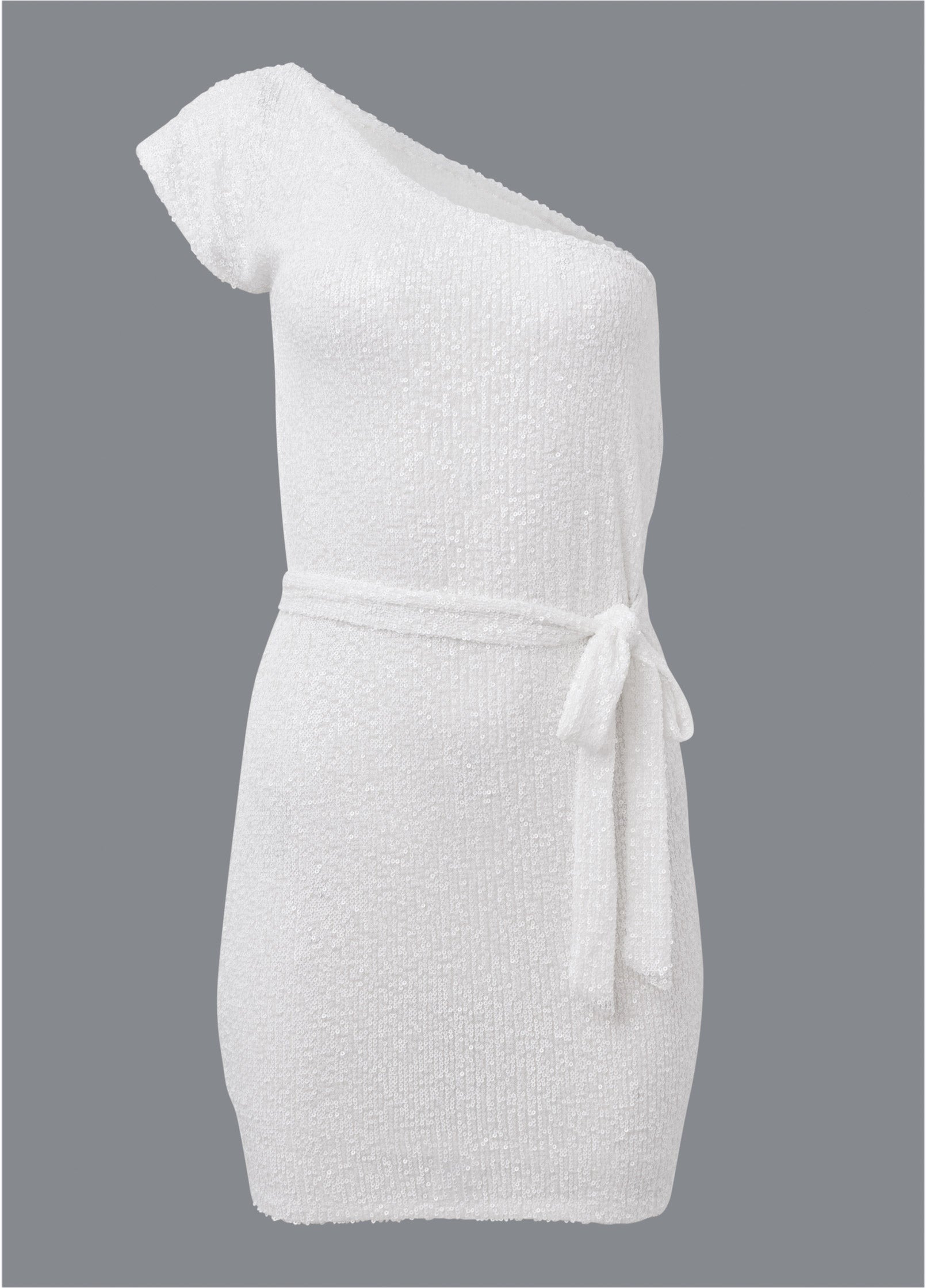 Shine the brightest at your next event when you make your entrance in this allover sequin min dress! Short yet powerful, this asymmetrical one-shoulder dress features a sash that ties around your waist for curve-defining allure. Blouse-out the top above the sash for extra fullness that flatters! * Sizes: XS (2), S (4-6), M (8-10), L (12-14), XL (16) * Plus sizes: 1X (18-20), 2X (22-24), 3X (26-28) * One shoulder * Blouson bodice * Hem slightly asymmetrical * 35" at shortest point; 39" at longest; varies by size * Allover sequins * Sequined sash belt included * Fully lined * Fabric has stretch * Poly/spandex. Imported