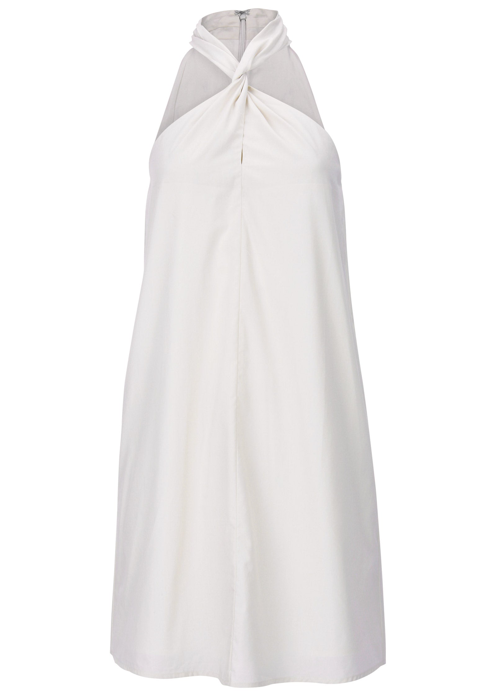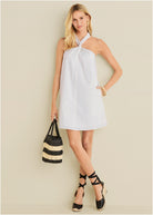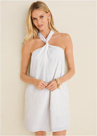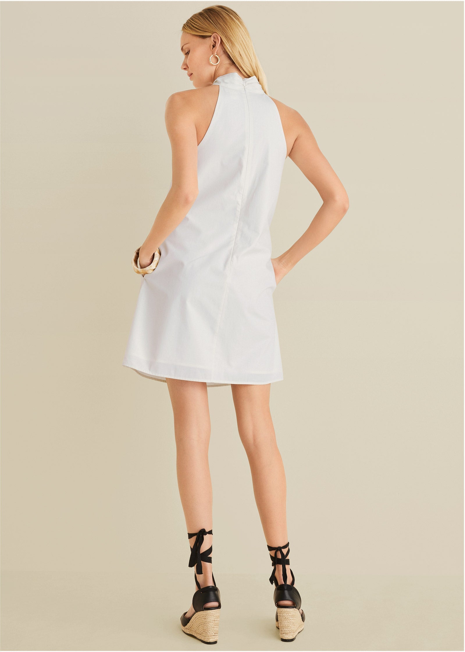 Hot and humid weather doesn't stand a chance against this mini dress. Done in our Clean Cut Cotton shirting fabric, it's breathable and durable with a crisp, cool-to-the-touch feel. To strike a balance we gave this A-line shift an elegant twisted halter neckline to add the perfect amount of softness. Wear it as-is or belt the middle to accentuate your waist.