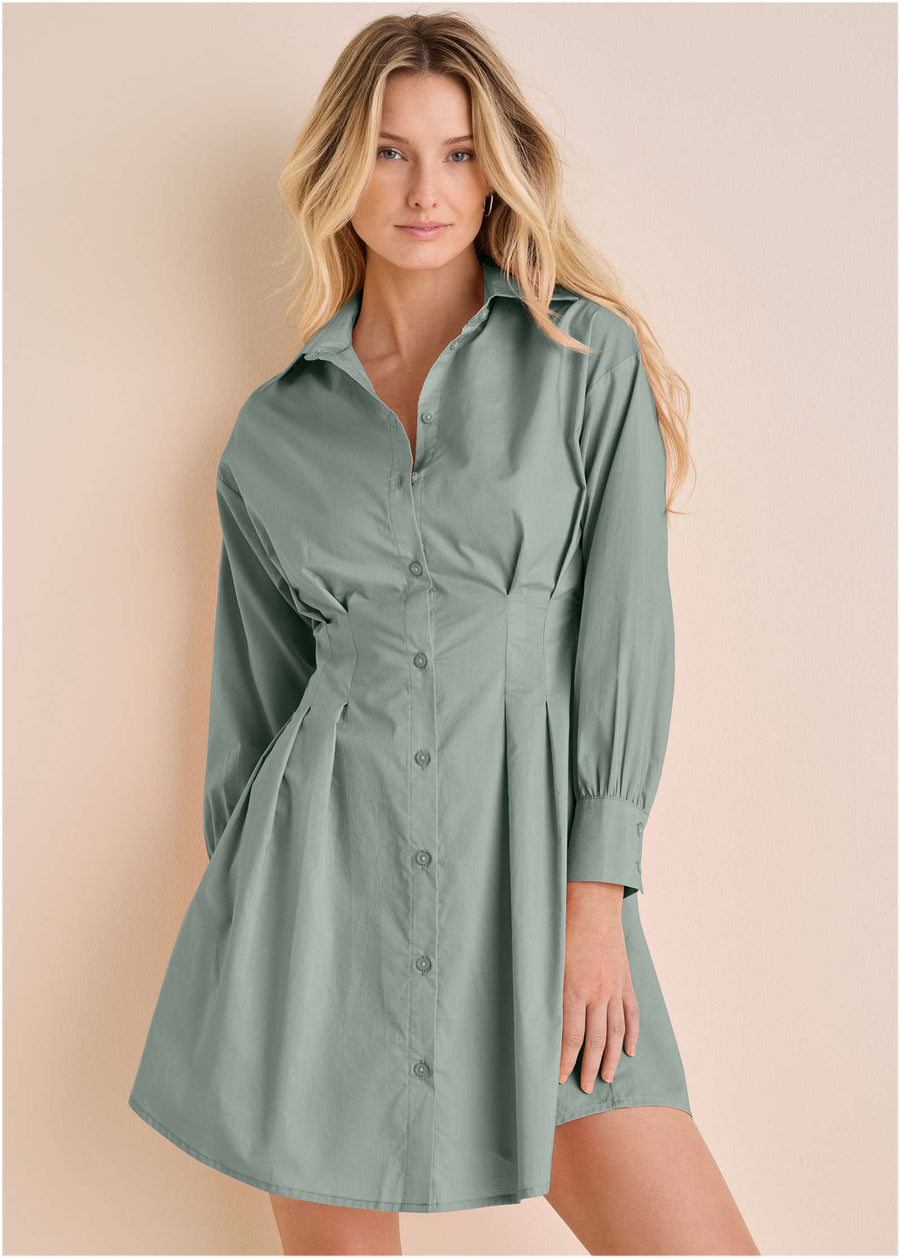 This button front poplin mini brings major polish with its collared neckline and long sleeves—but keeps things fun and flirty with a leg-flaunting length. Whether you're brunching, sightseeing, or sipping cocktails seaside, this dress is your shortcut to effortless style. Just add wedges and go.