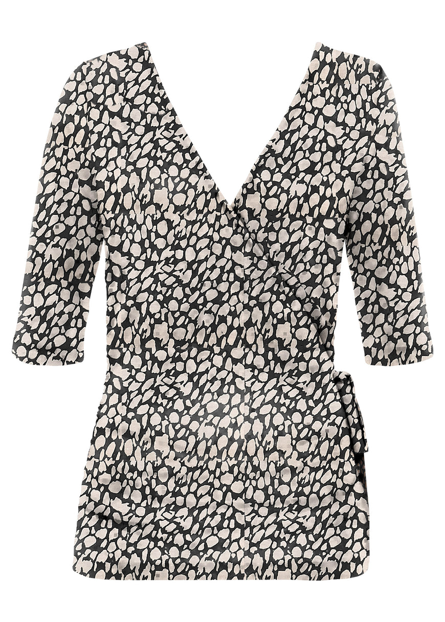 Everything about this top will have you wearing it on repeat. For starters, the faux-wrap front is finished with a side tie at the waist, creating a flattering silhouette. Then there are the three-quarter length sleeves that read sophisticated, while a deep-V in back makes a bold statement. Reach for this top day or night and prepare for the compliments to roll in.