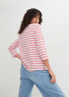 This boat neck striped top is your go-to for that timeless, nautical-inspired look. Featuring a flattering boat neckline and easy 3/4-length sleeves, it’s the perfect mix of polished and relaxed. Pair it with white pants or shorts for the ultimate vacay vibe—whether you’re strolling the boardwalk or sipping cocktails by the shore. * Sizes: XS (2), S (4-6), M (8-10), L (12-14), XL (16) * Timeless boat neckline: A classic silhouette with effortless elegance. * Nautical-inspired stripes: The perfect touch for a chic, seaside look. * Easy 3/4-length sleeves: Just the right coverage for breezy days. * Versatile styling: Pair with white pants, shorts, or denim for an instant vacation-ready outfit. * Organic cotton/elastane. Imported