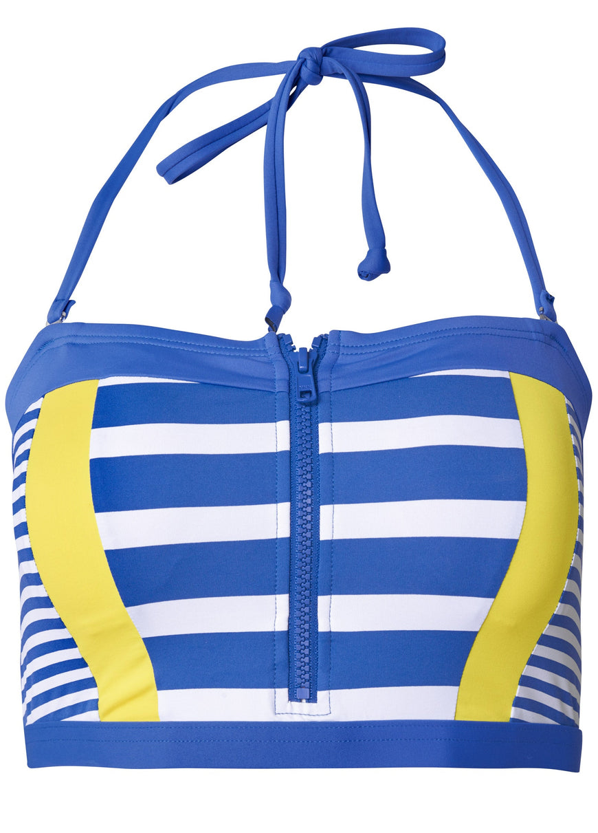 Bold contrasting stripes leave you looking sporty while the strapless bikini top is complete with a zip at the center front.