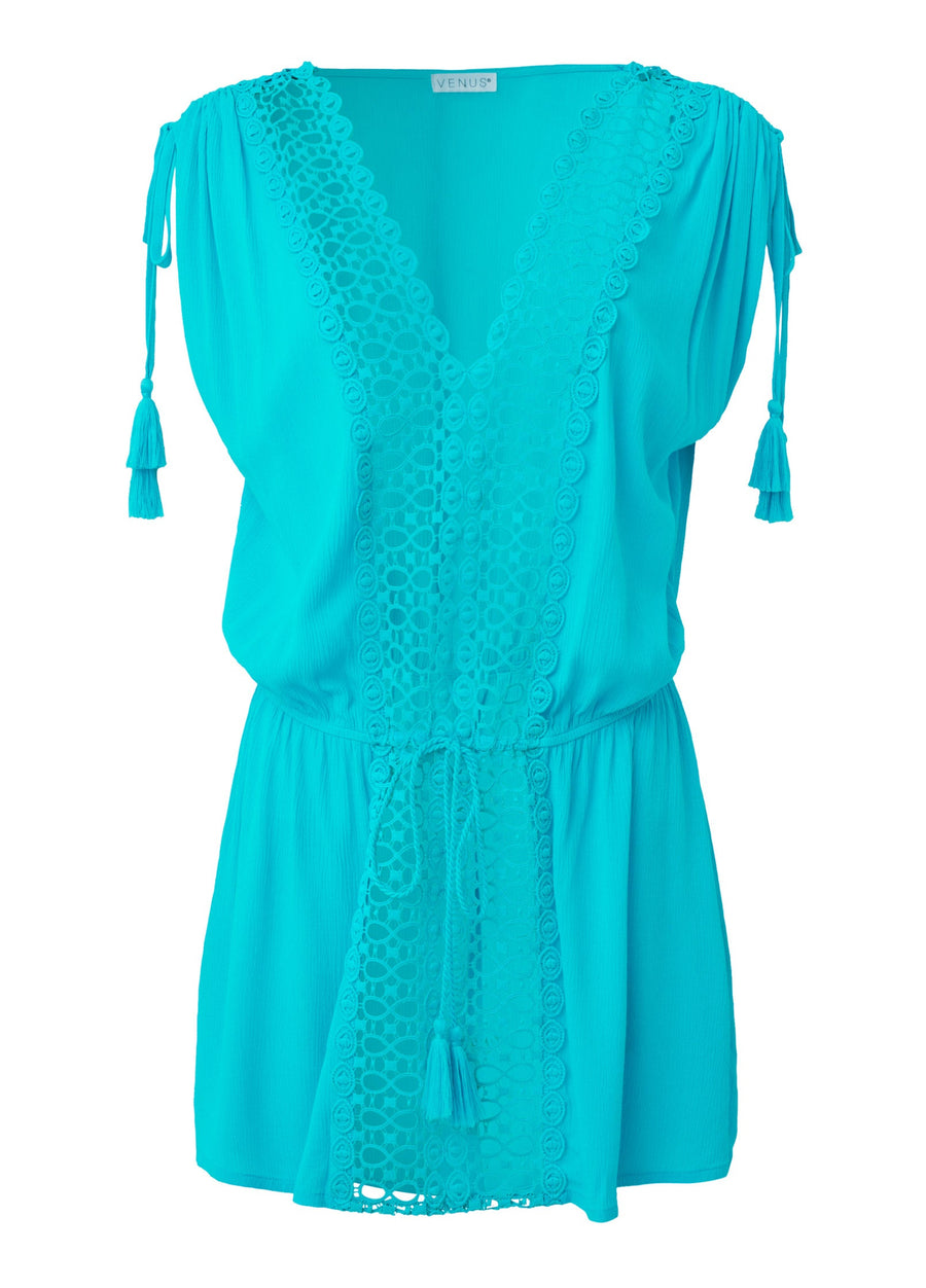 Fun in the sun starts with a playful cover-up, and this crochet detailed cover-up dress checks all the boxes. Blousy thanks to the elastic waist trim and high-on-the-thigh length, this feminine style keeps your look effortless with the added flair of tassel ties at the cap sleeves and waistline.