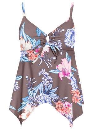 The built in bra, removable cups, and adjustable straps on this tankini ensure a perfect fit! The ruching around the front keyhole adds fullness to the bust and the sharkbite hem creates a slimming illusion. * Straps may be worn straight or crisscrossed for more support * For printed items; placement may vary * Sharkbite hem falls mid to low hip * Full back * Adjustable shoulder straps * Removable soft foam cups
